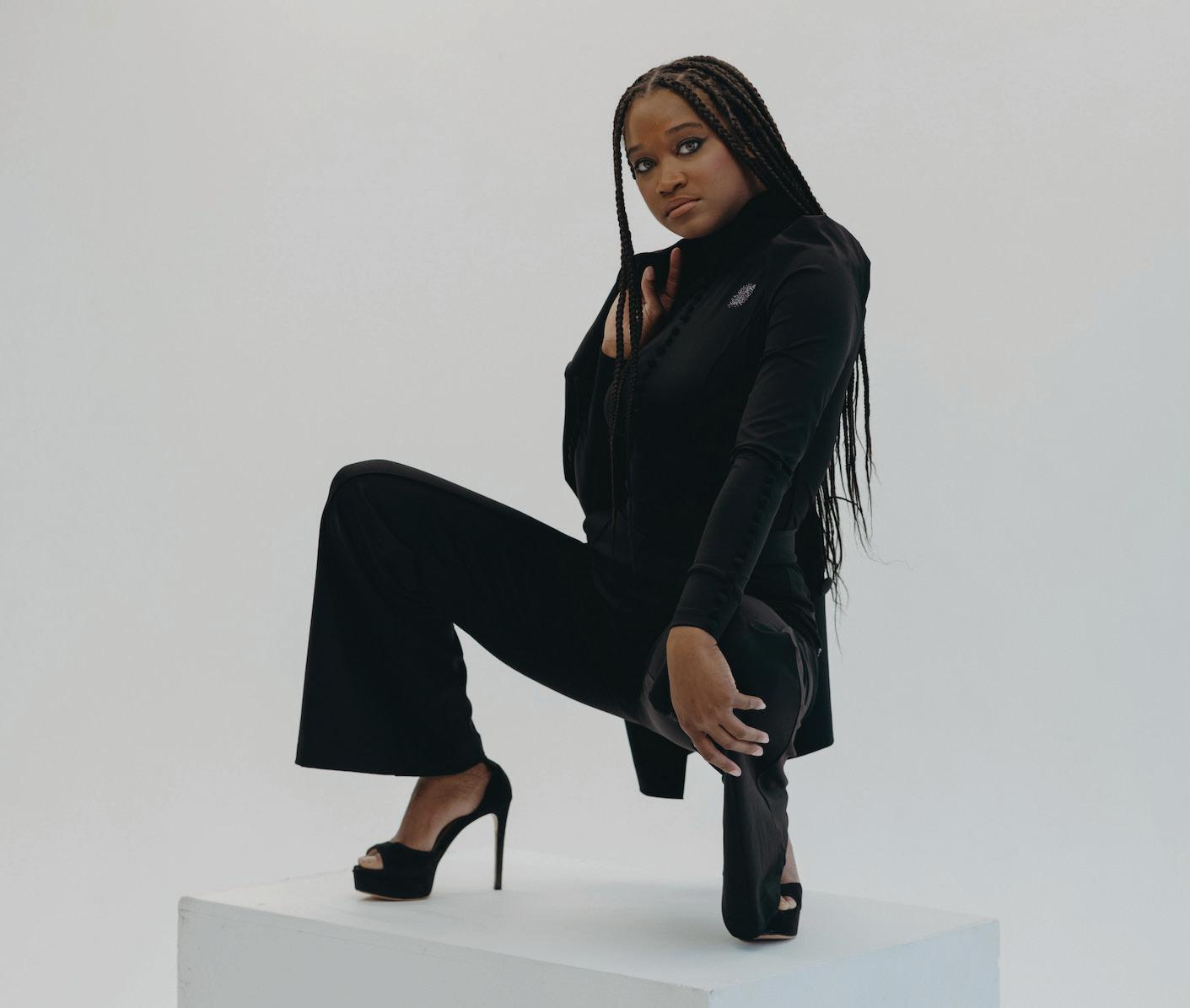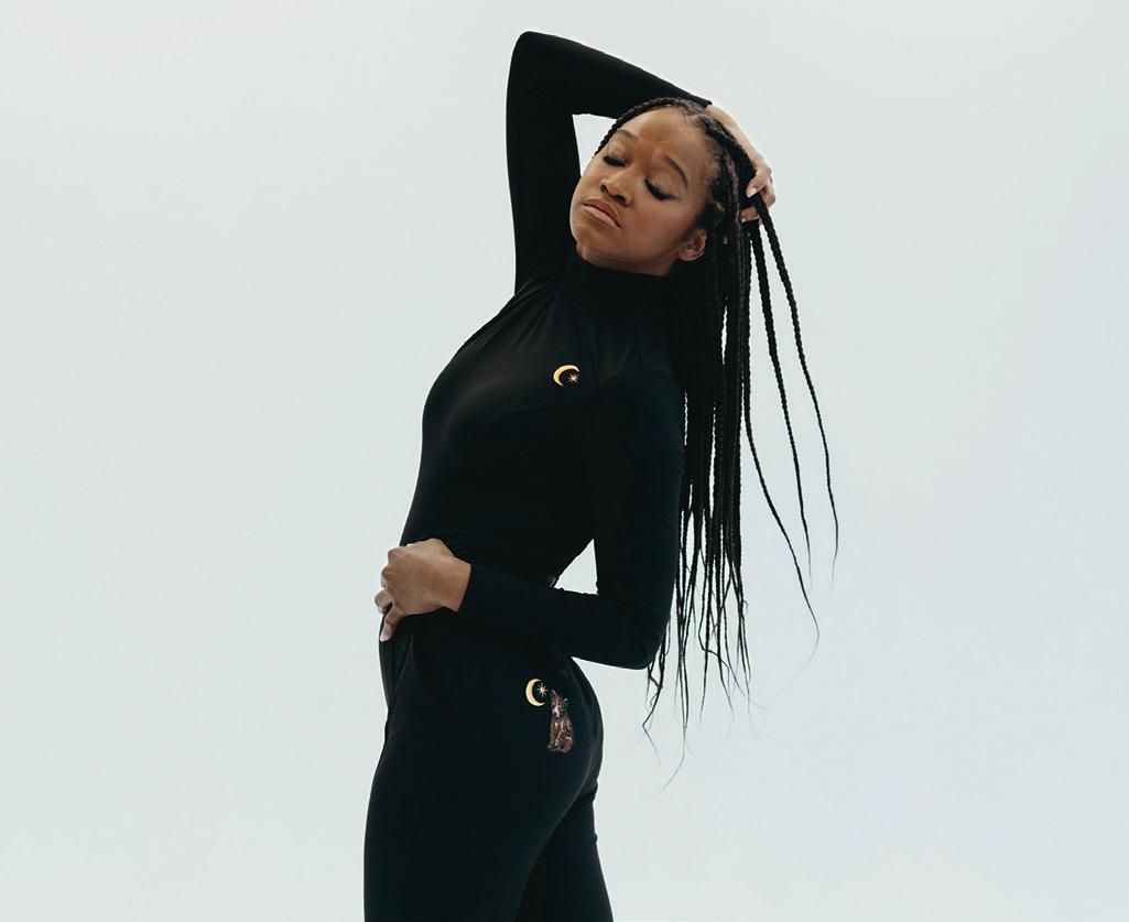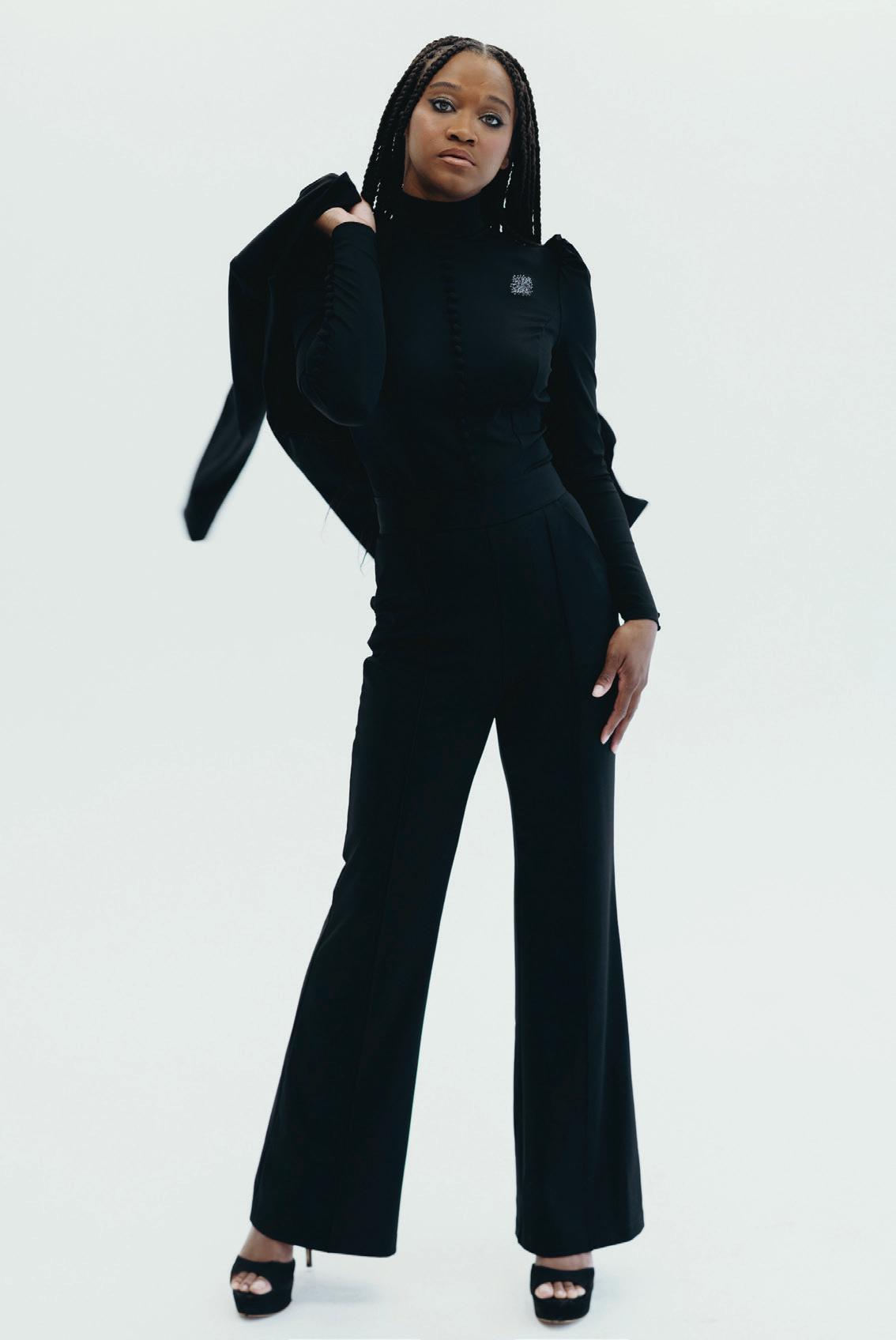 ‘Starry Night’ is perfect for those times when a fierce all black ensemble is required. The outfit is a chic, streamlined jumpsuit with structured puff shoulder details, and coupled with an oversized tuxedo jacket. The starry details on the jumpsuit add a touch of glamor, and made with lustrous fabric, comfort is not compromised.