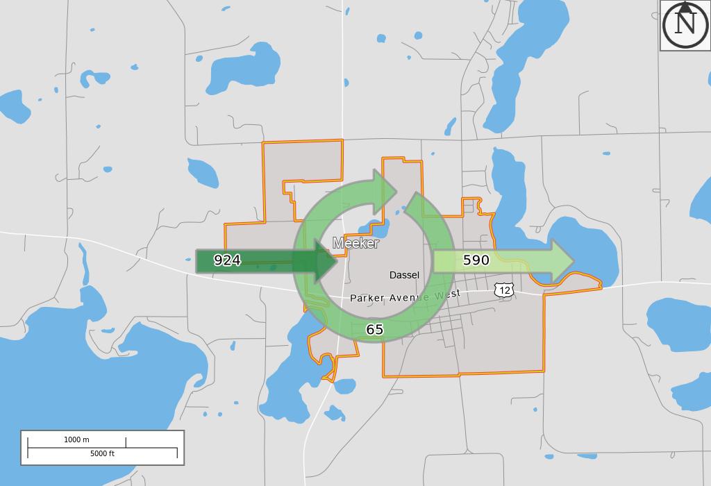 According to the American Community Survey, many of Dassel’s residents that commute, age 16 and older, live between 5 and 20 minutes from their place of employment. A sizeable portion of commuters – almost 12% – live between 60-90 minutes from work. The map below shows the inflow/outflow of jobs within Dassel’s boundary; nearly twice as many people enter the City for work than commute to locations outside the boundary.