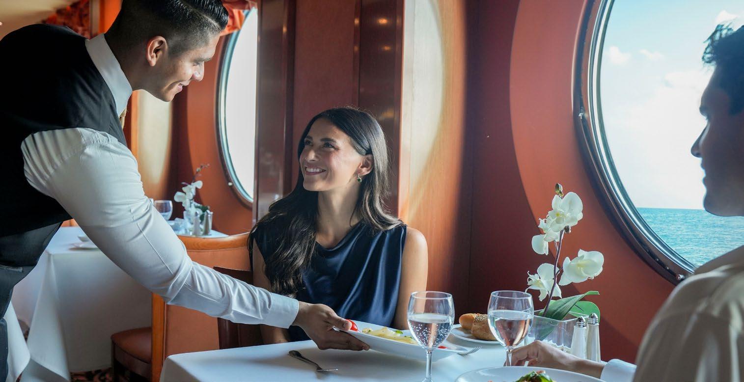 Cada comida en el barco te llevará a un viaje de descubrimiento con deliciosos platos inspirados en cada destino y especialidades diarias basadas en ingredientes locales frescos