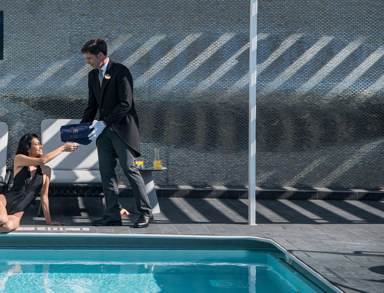 I MSC Yacht Clubs eksklusive omgivelser er et dedikert team stolte av å kunne levere omsorg døgnet rundt. Enten det er en butler som eskorterer deg gjennom prioritert ombordstigning før du pakker ut bagasjen, en concierge som arrangerer en skreddersydd utflukt, en kokk som tilbereder god mat eller en sommelier som velger ut en ideell vin til middag, du vil bli bortskjemt med eksepsjonell service på hver tur. Fra det øyeblikket du går om bord til du går i land, vil vårt engasjerte team forutse alle dine behov og oppfylle alle dine ønsker, slik at du kan slappe av og nyte luksusen.