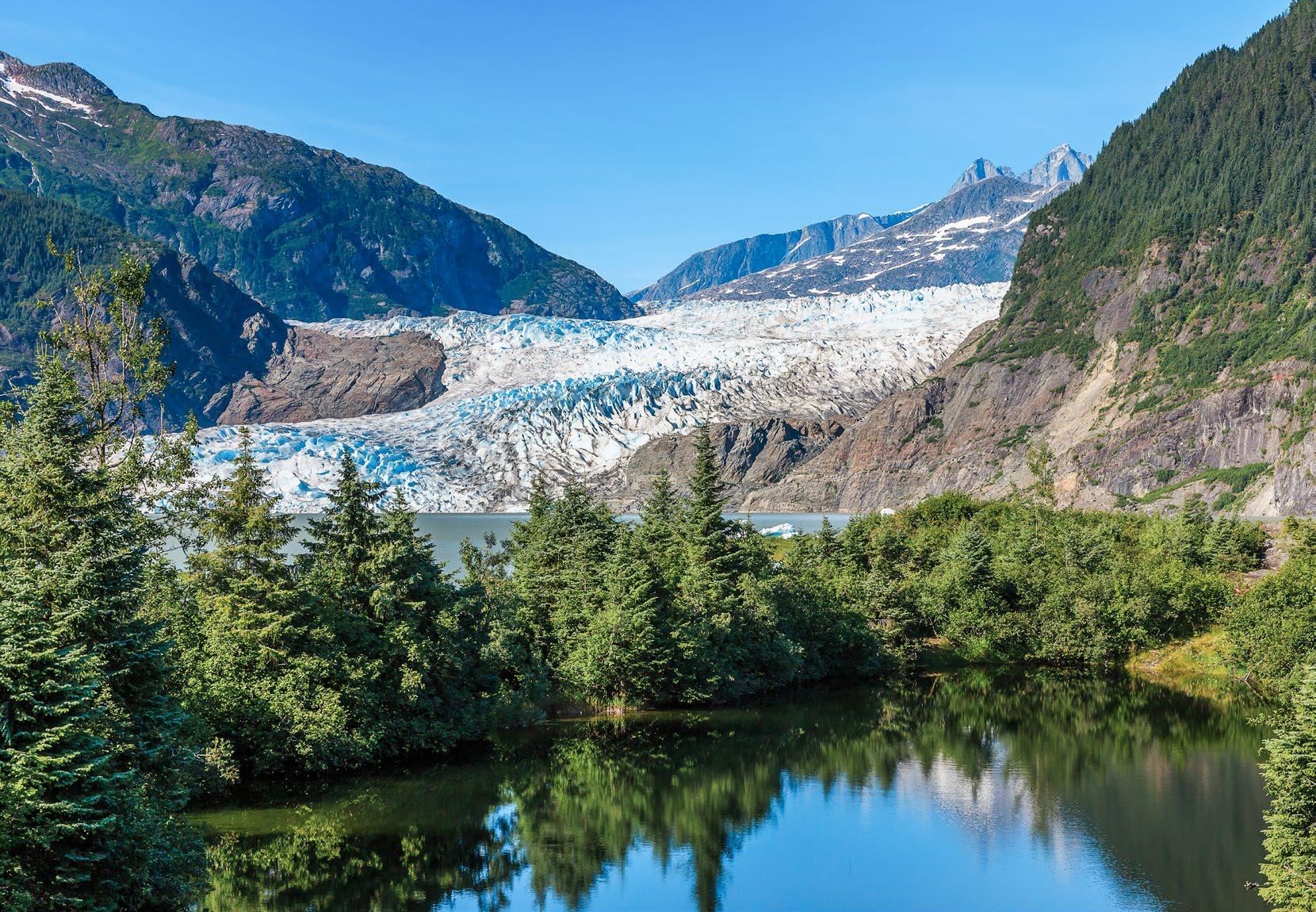 Sobrevoe as florestas tropicais e vales do Sudeste do Alasca até aterrar no Glaciar Mendenhall. Explore gelo azul, fendas profundas e picos deslumbrantes com guias especializados. Descubra os segredos do glaciar, beba água derretida pura e capture vistas inesquecíveis. Uma verdadeira aventura de sonho para a sua lista de desejos.