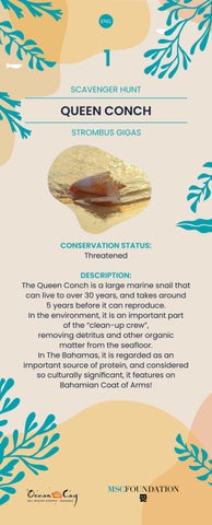Die Königin Conch ist eine große Meeresschnecke, die über 30 Jahre alt werden kann und etwa 5 Jahre braucht, um sich fortzupflanzen. Im Ökosystem ist sie ein wichtiger Teil des „Reinigungsteams“, da sie Detritus und andere organische Stoffe vom Meeresboden entfernt. Auf den Bahamas gilt sie als wichtige Eiweißquelle und ist so kulturell bedeutend, dass sie sogar im Wappen der Bahamas abgebildet ist!