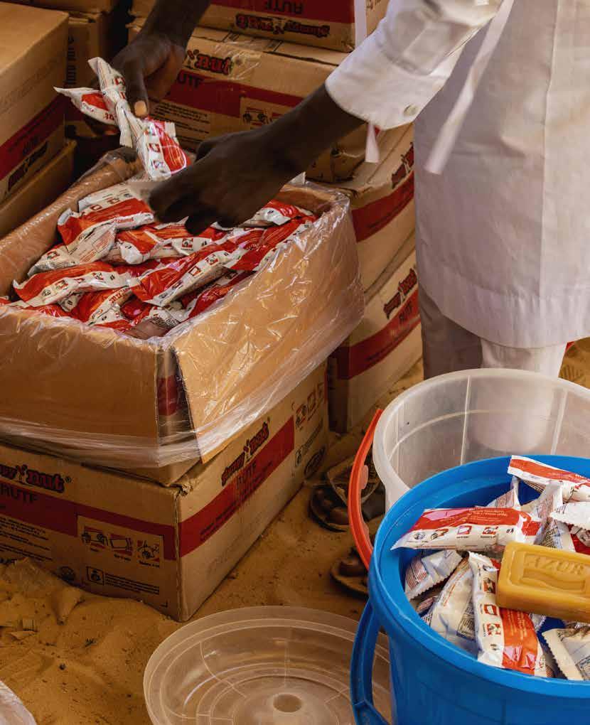 Preparing to distribute the highly nutritious nut-based paste, Plumpy’Nut, in Chad. The sachets are used to treat acute malnutrition.