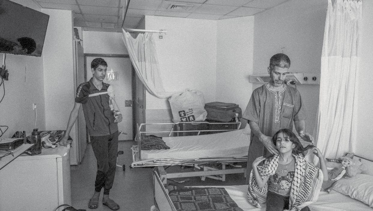 Right top: Shahed, 16, takes a reading class in the hospital. She is undergoing comprehensive treatment following the amputation of her leg in Gaza. An airstrike on her home caused her injury and killed her father and sister.