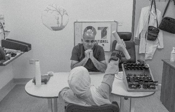 Right below: Dima, 11, during an occupational therapy session. The small number of patients receiving rehabilitative care in the Amman hospital is barely a fraction of the number of people in need of this treatment in Gaza. “We know from our experience at the hospital, where we have treated people with war wounds from the region for nearly 20 years, that typically up to four per cent of people who suffer war injuries will need reconstructive surgery,” says Moeen Mahmood Shaief, MSF head of mission in Jordan. This translates to up to 4,000 people in Gaza. However, requests for the medical evacuation of patients have been continuously denied by Israeli authorities.