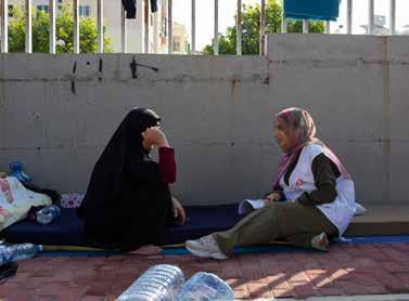 Um Mohammad, a Syrian refugee woman, speaks with an MSF worker in the Saida parking lot where displaced people are sheltering. © Dalia Khamissy