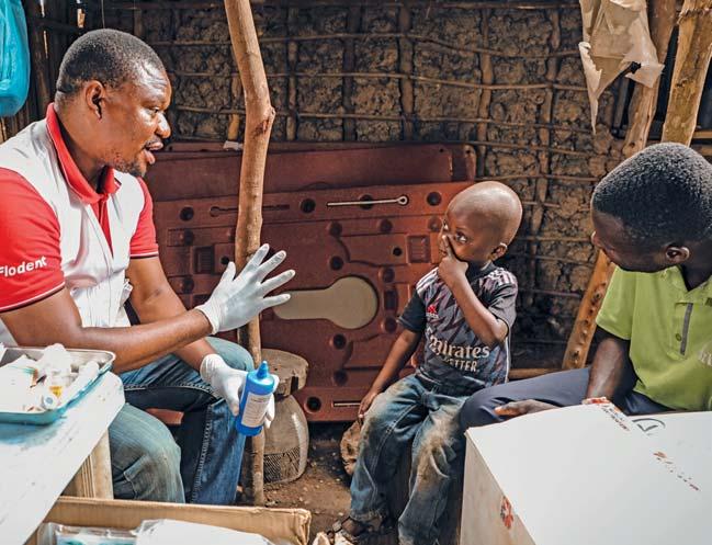 MSF nurse Evariste Bayedi talks to a boy at Simbambéli clinic in Kwamouth. The child’s father had planned to sell his plot of land so that he could afford to take his son to the capital, Kinshasa, for medical treatment, but the arrival of MSF’s mobile clinic meant that he could be treated free of charge on the spot. In July 2022, intercommunal tensions erupted in Kwamouth, leading to an attacked, wounded and killed. An MSF team arrived in the area on 24 August to run mobile clinics and provide the displaced people with clean drinking water.