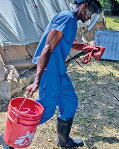 An MSF team member carries a bucket of chlorinated water in a cholera treatment centre in Cité Soleil, Port-au-Prince, after a cholera outbreak was declared on 2 October. MSF has set up cholera treatment centres in four locations across the country. People in Haiti face spiralling violence, a severe fuel shortage and trouble getting hold of clean water and medical care. “Unsafe water is one of the main causes of the spread of cholera,” says MSF medical coordinator Auguste Ngantséléi, “Without drinkable water and good waste management, there is a very high risk of a spike in the number of cholera cases, and this needs to be addressed urgently.”