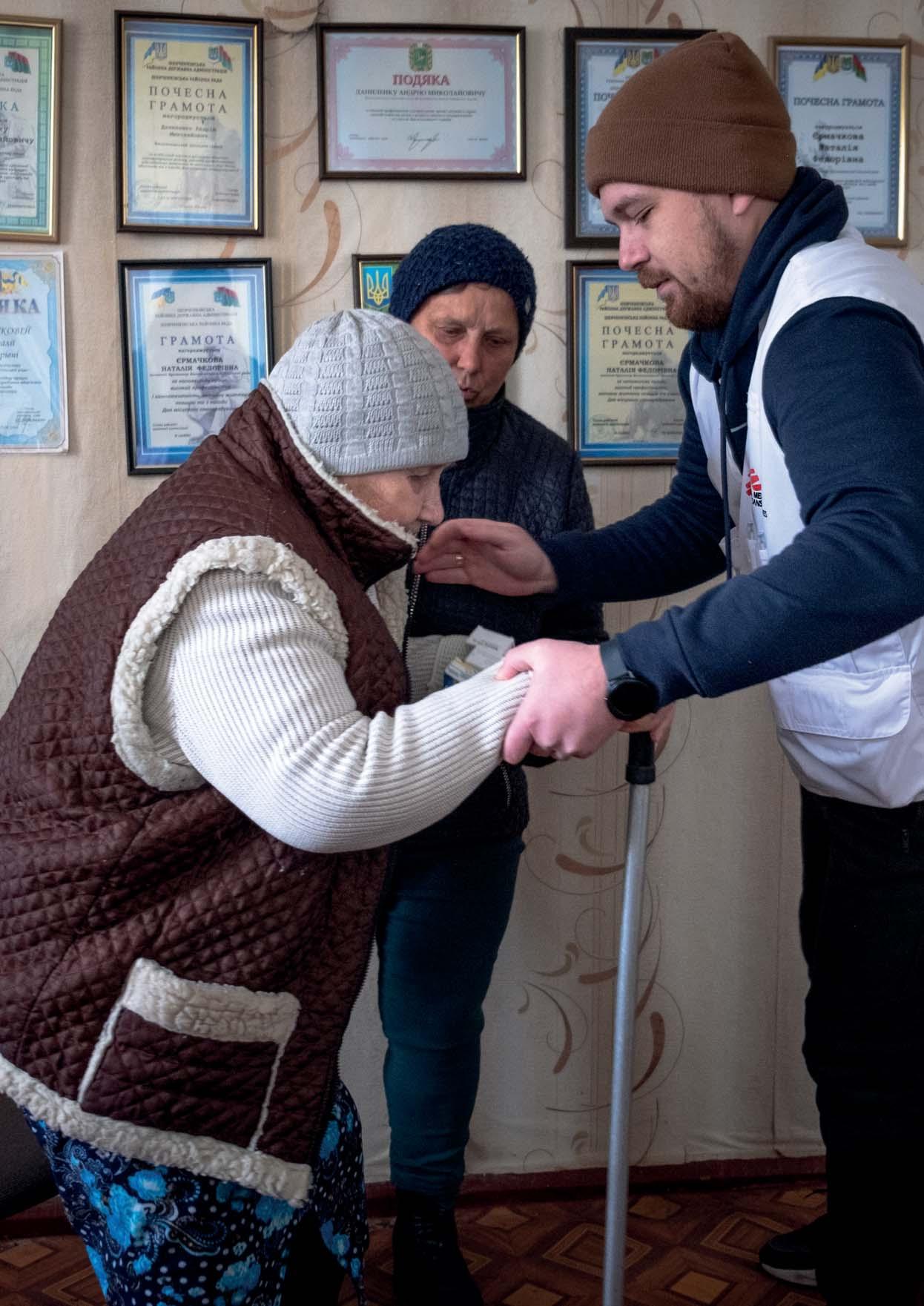 Maria, who has diabetes, is helped to her feet by MSF’s Dr Igor Bodnia at a mobile clinic in eastern Ukraine.