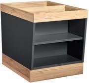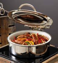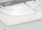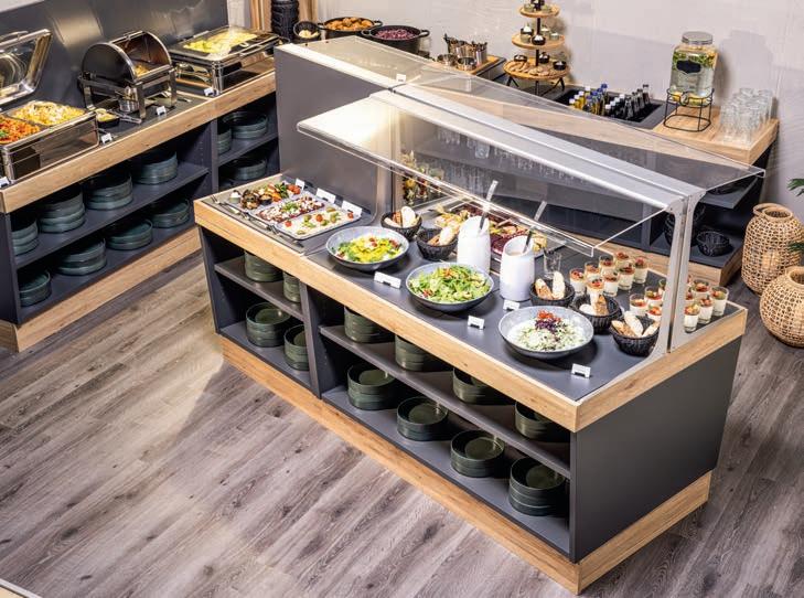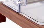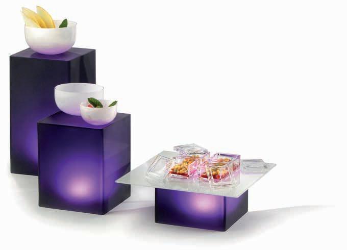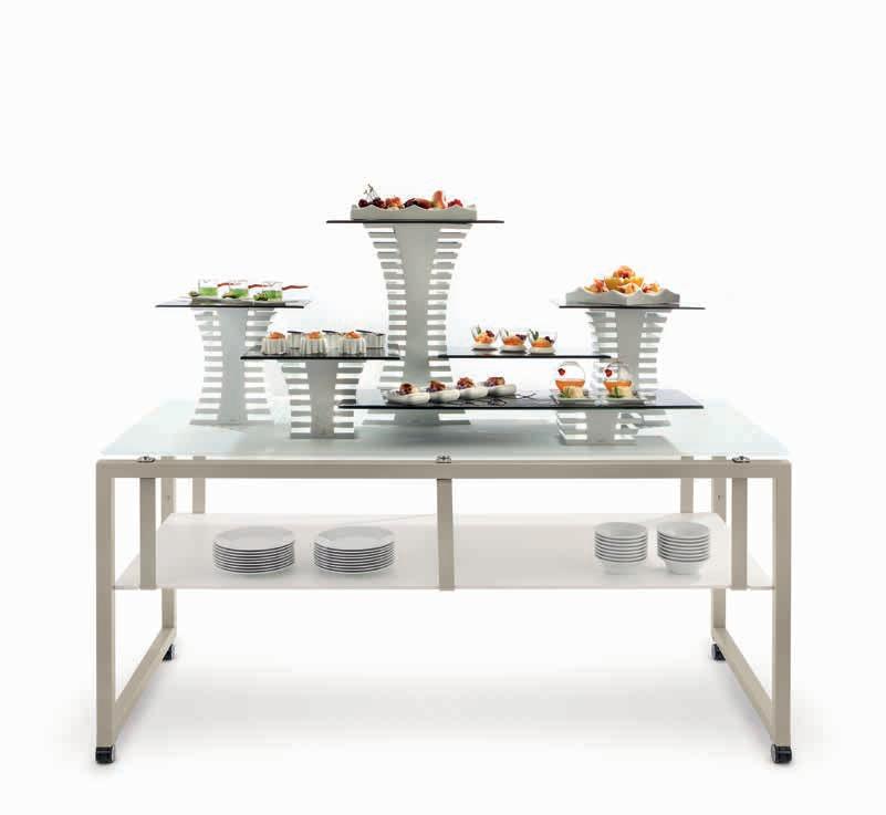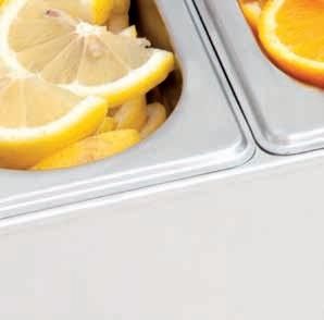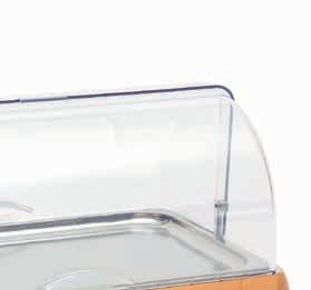 Base in acciaio inox 18/10 / cloche monoblocco con grande apertura su due lati, fi ssata sulla base / refrigerato con mattonella eutettica professionale / vassoio esterno GN 1/1 disponibile in accaio inox 18/10, porcellana e polietilene con maniglie