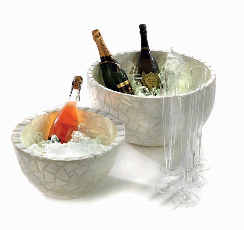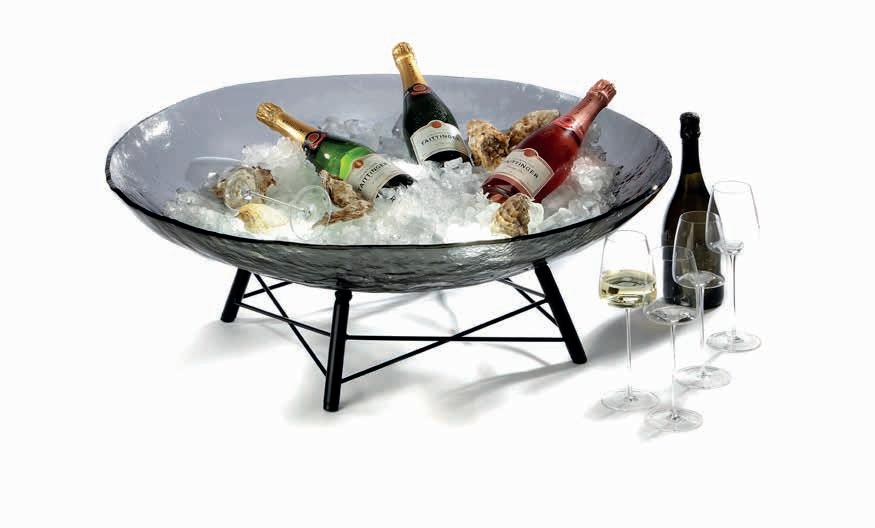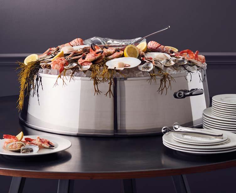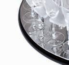 18/10 stainless steel round base / round roll top cover monobloc fi xed on the tray underneath with big openings on two sides / chilled with professional ice packs / service tray in 18/10 stainless steel, porcelain and revolving 360° PE tray
