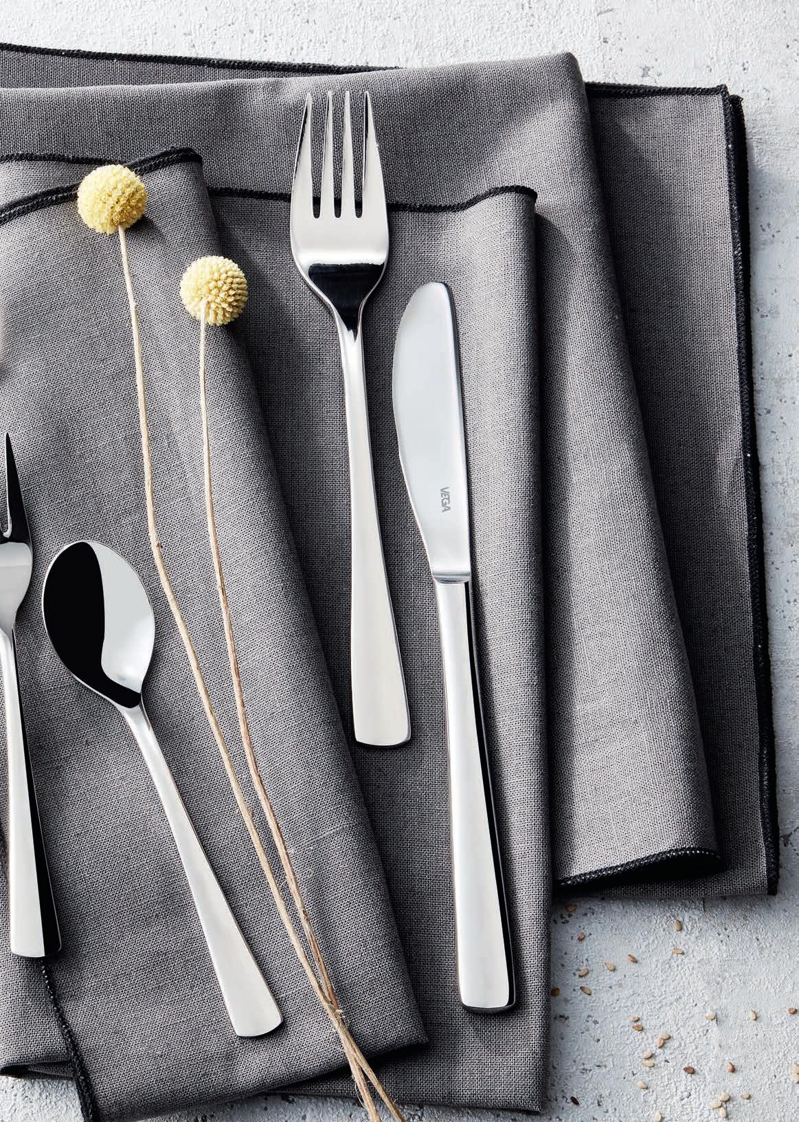 The distinctive character of the new cutlery collection is shaped by a natural movement, flowing smoothly towards the front of the cutlery piece. The handle with its diagonally changing profile edge that forms a triangular shape at the end of the handle, is inspired by a cut off branch out of nature. The unique design feature of TRILOGIE enables tasteful experiences at the table that will be remembered.