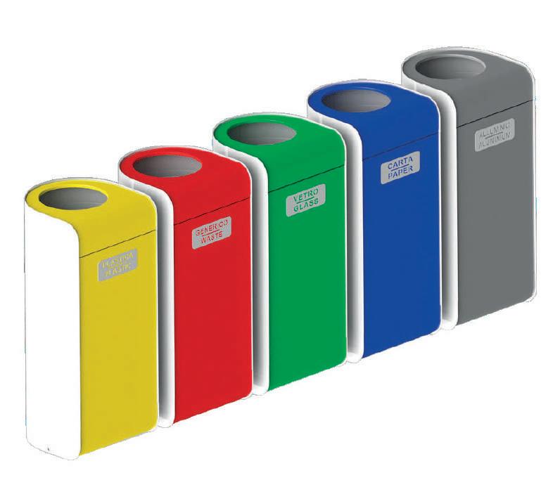 Article € Description Capacity Lt Max dim. cm 2565 207,00 Red for general waste 25 30x30x70 h 7,3 2566 207,00 Yellow for plastic 2567 207,00 Green for glass 2568 207,00 Blue for paper 2569 207,00 Grey for aluminium Opening detail cm M 32x32x77 h 8