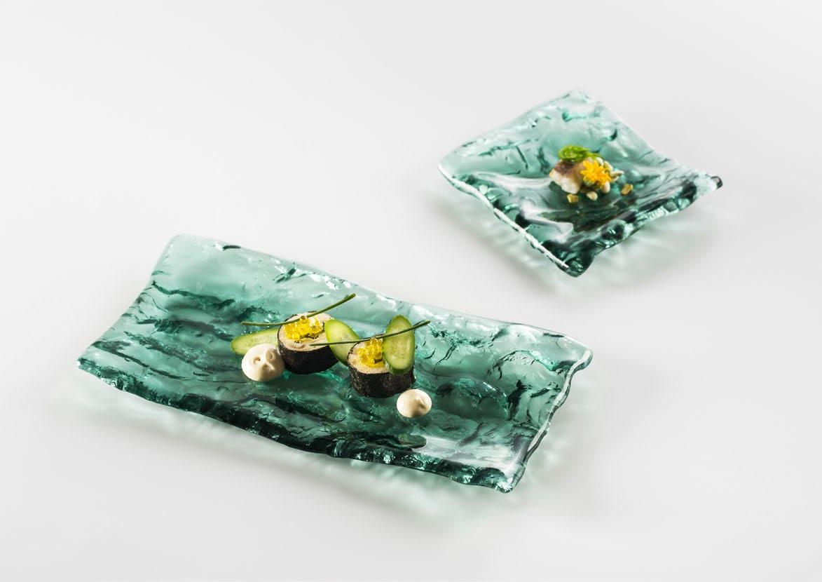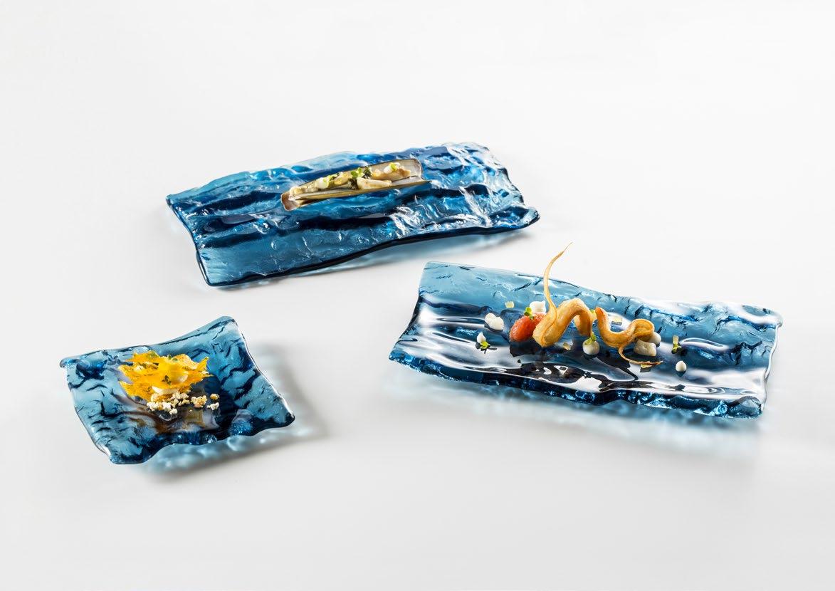 Contemporary glass dinnerware designed and produced individually by hand from talented craftsmen.