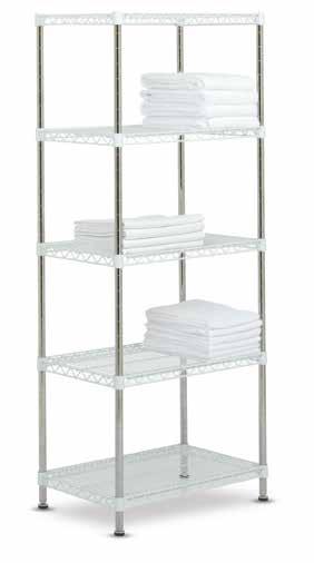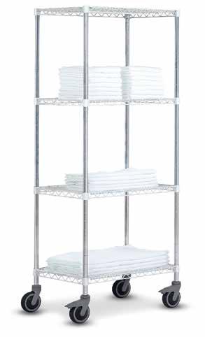 High gloss, chrome-plated uprights with top end caps and plastic feet or 4 swivel castors, 2 with brakes, castor wheel diameter 125 mm. Wire shelves in high gloss chrome-plating or plastic powder coating, white. Plastic clamping jacks for assembling wire shelves with a mesh width of 165 x 20 mm.