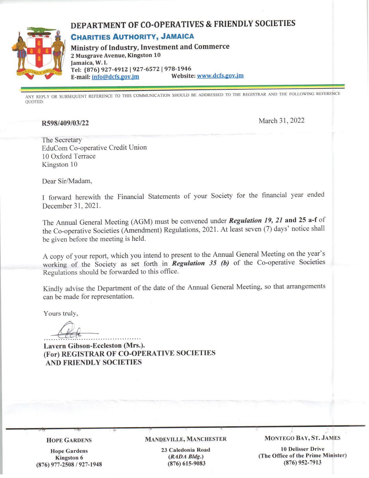 There is no better way to begin this message but to comment on the outstanding efforts of the team in such a difficult operating environment in 2021. When Jamaica experienced the first COVID case in March 2020, who would have predicted that two years later we would still be wrestling with its impacts, in every sector of the economy, and by extension, globally. Operating under COVID restrictions has been challenging, but the team was relentless in its pursuit of excellence, and we are delighted at the efforts and the results that have been achieved, through this strong desire to succeed. The team has demonstrated true determination, resilience, and commitment in continuing to serve our members and I applaud their efforts.