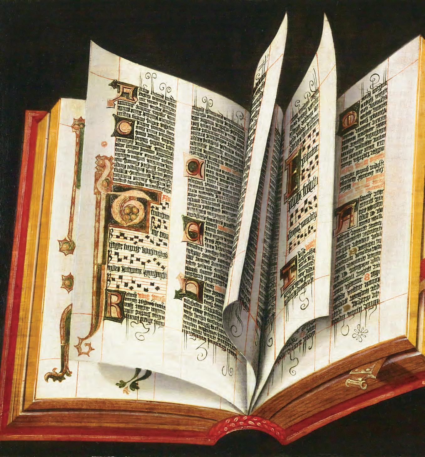 Extraordinary in its technique and rarity, this exceptional painting of an illuminated manuscript displays an astounding trompe l’oeil effect and is one of only 17 known works of its kind. The lavishly decorated manuscript emerges from the dark background in masterful splendor, its fluttering pages almost palpably lifting off the panel.