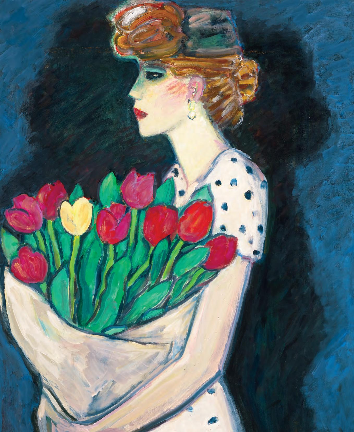 A bold celebration of color and glamour, this dynamic portrait is a testament to celebrated French artist Jean-Pierre Cassigneul’s command of bold color, rich impasto and alluring drama. The artist’s signature sophisticated beauty is rendered here in profile, her delicate complexion contrasting with the intensity of the deep blue background and her colorful bouquet.