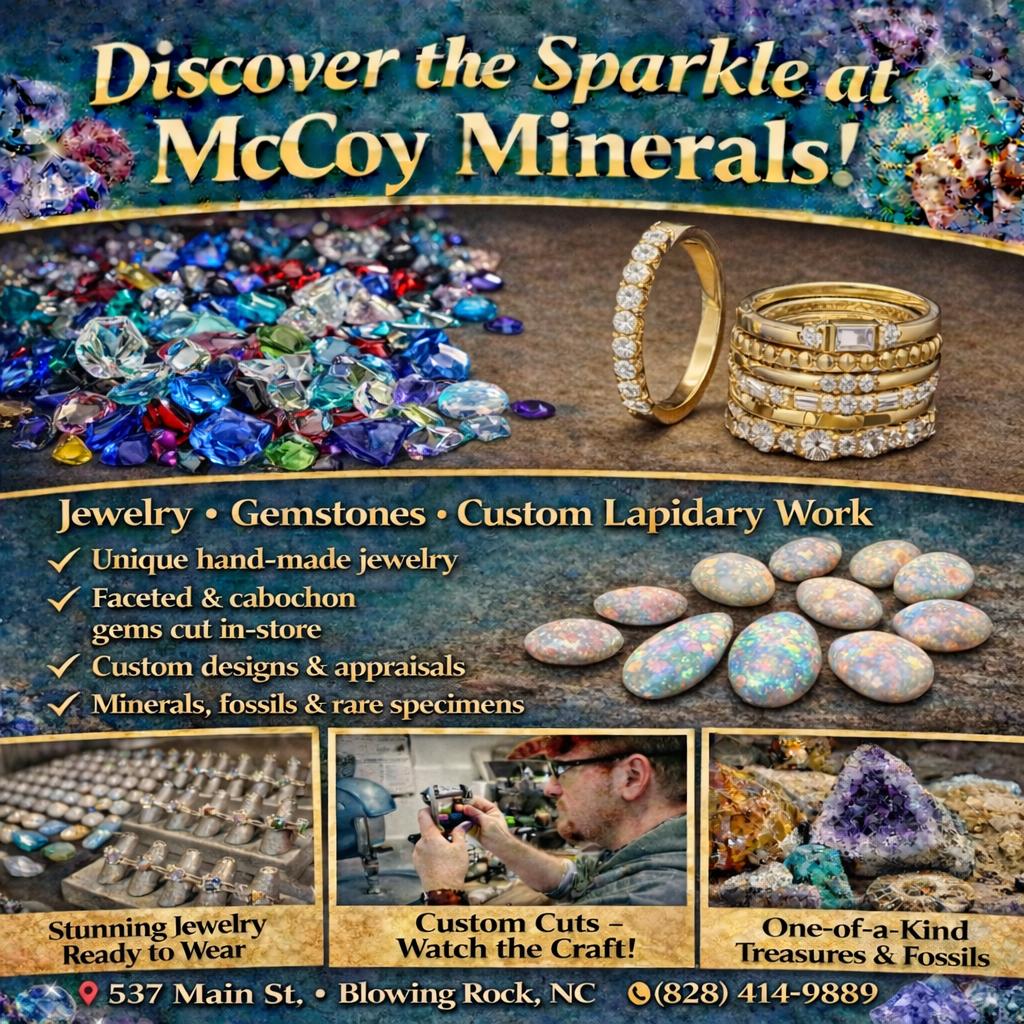 Visit McCoy Minerals for a free facet gemstone cutting demonstration. McCoy Minerals is located at 537 Main Street in Blowing Rock.
