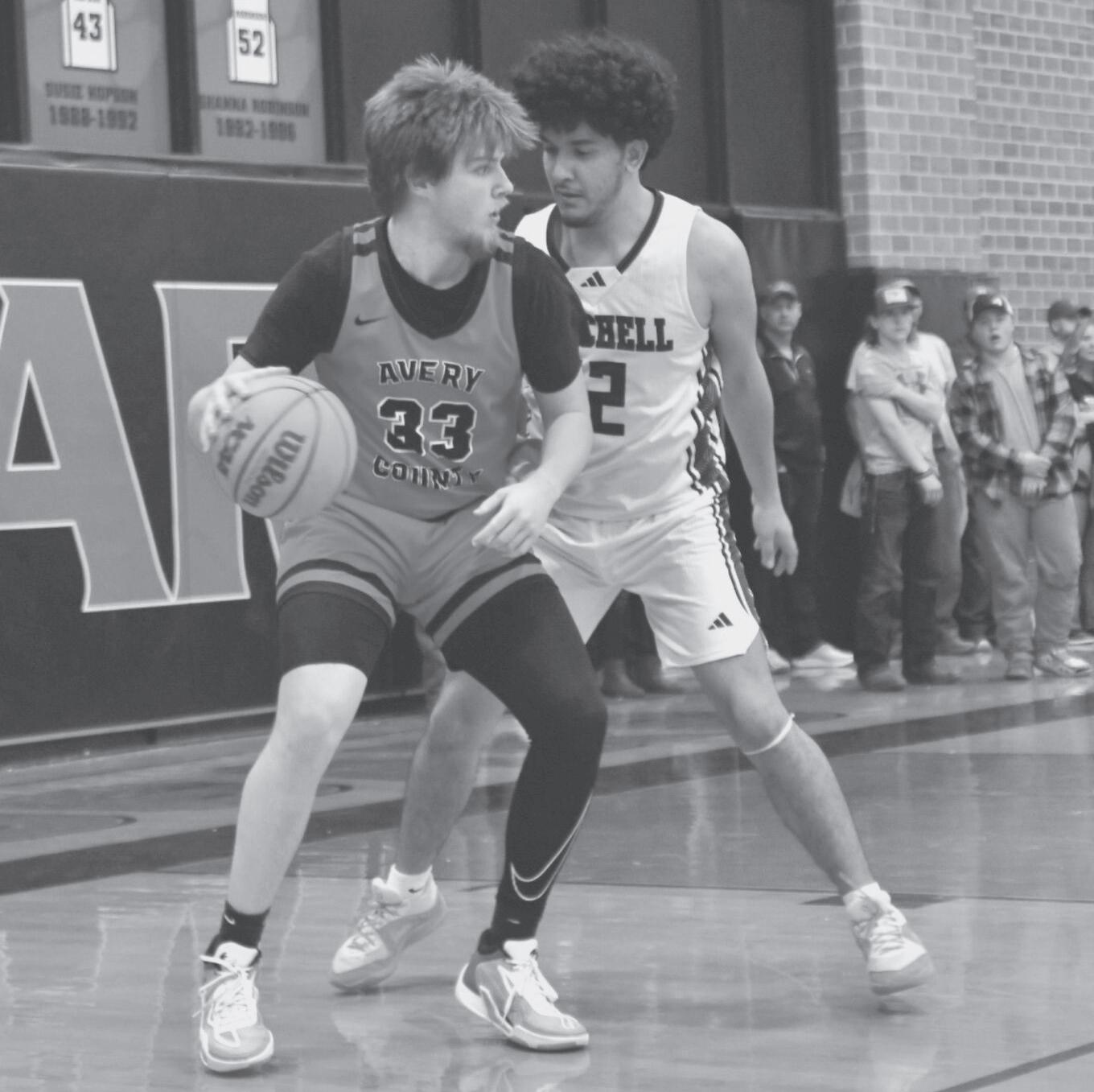 Avery’s Mason Bailey backs down a Mitchell defender during the finals of the Western Highlands Conference Basketball Tournament. Bailey overcame a congenital heart defect and heart surgery during high school to garner All-WHC honors and the opportunity to play collegiately at LeesMcRae College.