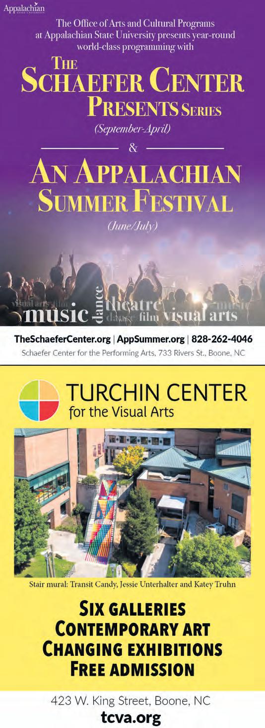 porary and emerging artists. Artists of all ages and walks of life have had their art shown at the Nth Degree Gallery and mediums range just as much, including ink, printmaking, photography, paintings, ceramics, fiber arts and more. To learn more, visit www. facebook.com/nthgallery. Whether visiting a gal lery for an immersive visual experience or hearing tunes from the heart of Appalachia, there’s no shortage of artistic experiences to broaden your horizons while in Boone.