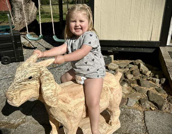 Riley Henderson is shown trying out one of her father’s woodcarvings. This is a carving of a goat.