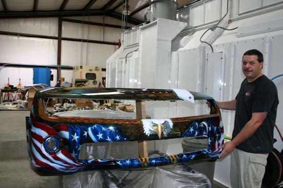 Maurice Rogers, who did the clear coat for the American Pride Camaro, is shown in the shop working on the vehicle.
