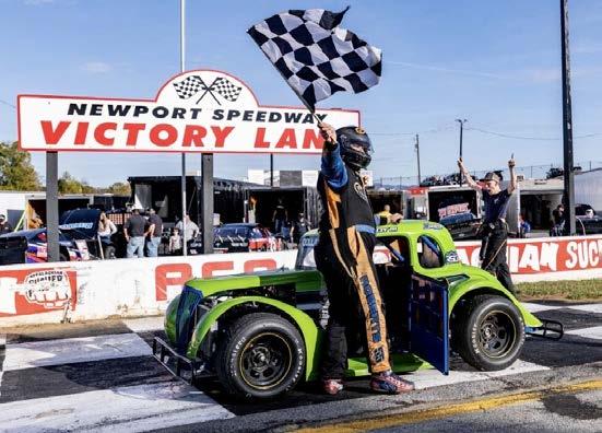 Mardy Roberts III waves the checkered flag after winning the Legends race on Oct. 25 at Newport Speedway.