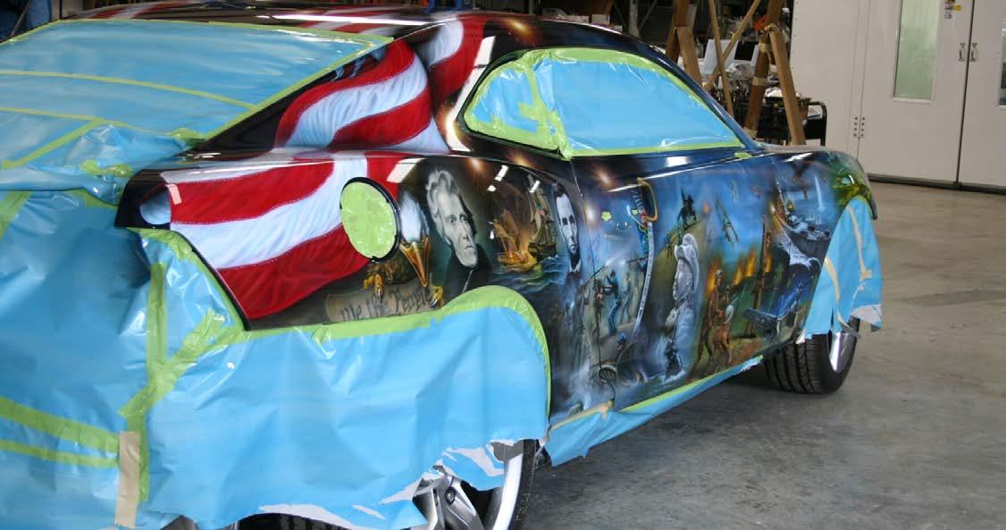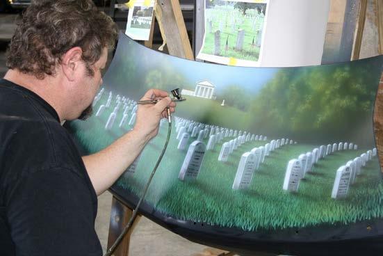 Mickey Harris is shown airbrushing the Arlington National Cemetery scene on the trunk of the American Pride Camaro.