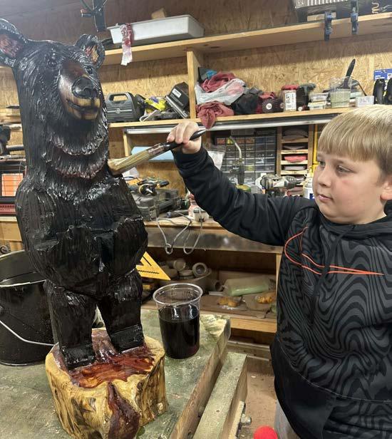 The Hendersons have two children, Noah, 10, and Riley, 3. Noah helps add the clear coat on some carvings. The carvings have become a family project.