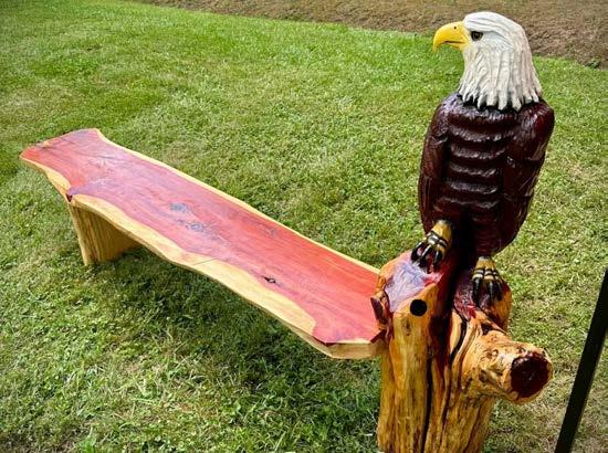 This cedar bench adorned with a bald eagle is a creation made by Eric Henderson.