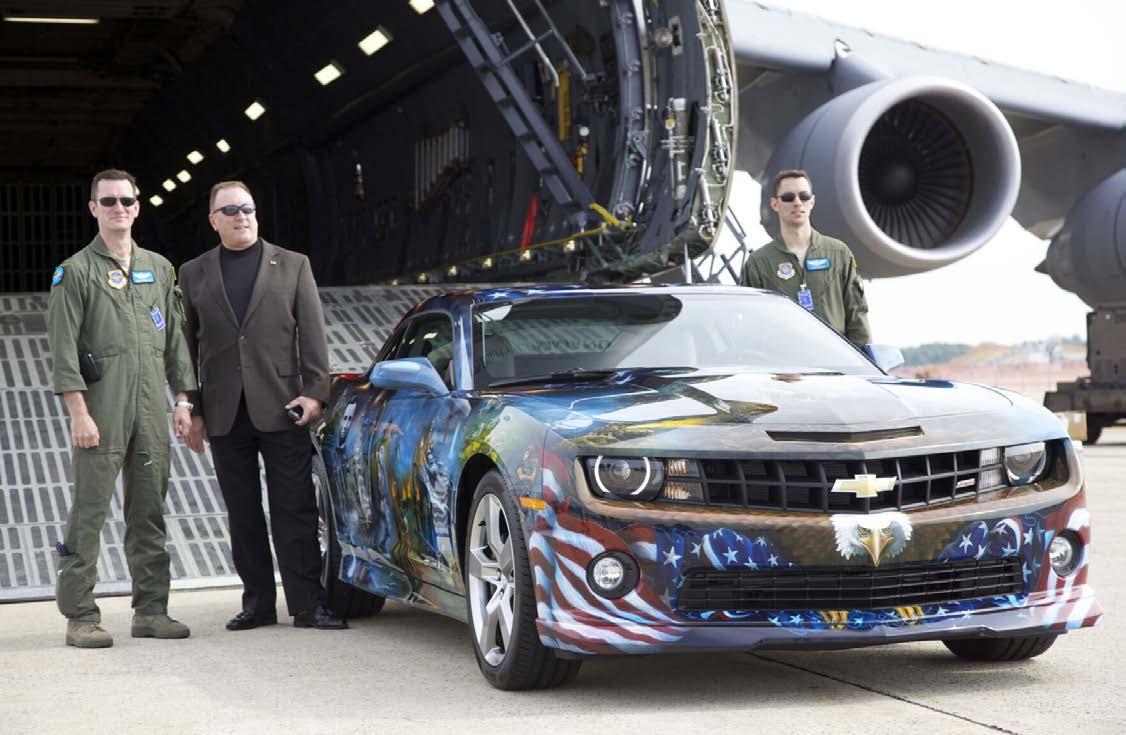 The American Pride Camaro is shown at an air show in front of a cargo plane. The vehicle has appeared at car shows, air shows and various events throughout the years.
