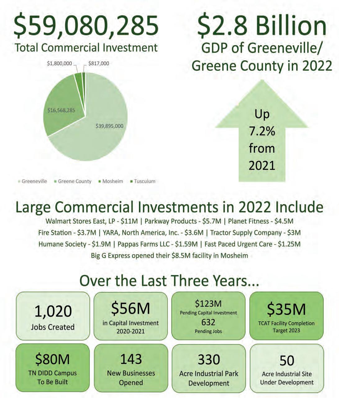 What a time to be living, working and playing in Greeneville and Greene County! Despite the challenges of covid and the supply chain difficulties over the last few years, our community is thriving. We’ve seen unreal growth in capital investments, job creation and residential housing. Our Gross Domestic Product (GDP) is $2.8 BILLION!