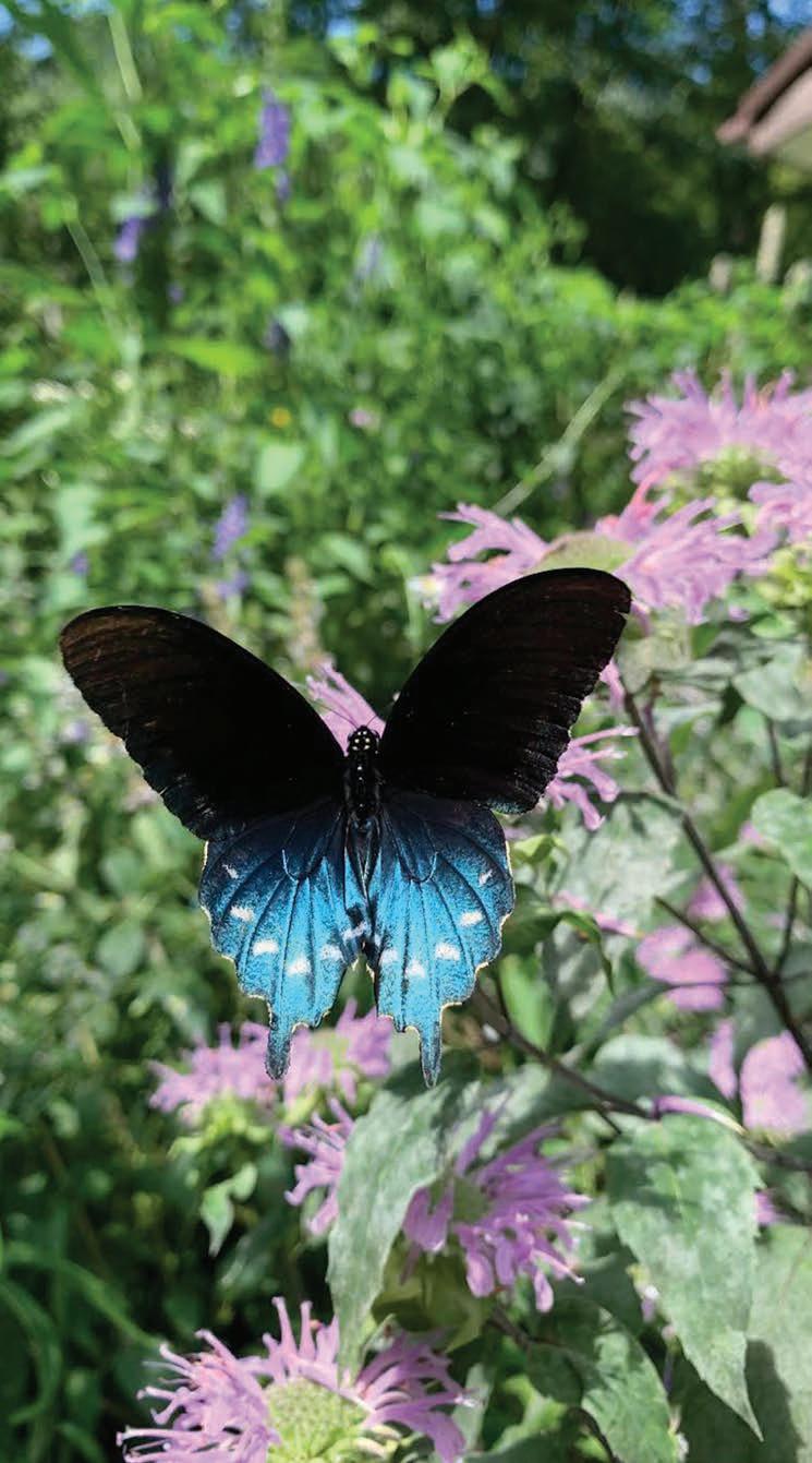 plants, partly for how easy they are, partly because they are so beneficial for local birds and insects, and partly because we love how they look,” Serrell says. “We planted rhododendrons, pink bee balm, mountain mint, tall bellflower, red columbine, yellow coneflowers, dwarf irises, Joe Pye Weed, a variety of asters, white trilliums and many other plants. We used a combination of a seed mix from Prairie Moon and some seedlings. Everything has filled in nicely and comes back even better than the year before, with very little work aside from weeding out any invasives that try to choke out the wildflowers… Our garden looks a little wild in the peak of summer, but it’s a delightful mix of colors, textures and scents — and always full of interesting, gorgeous insects.”