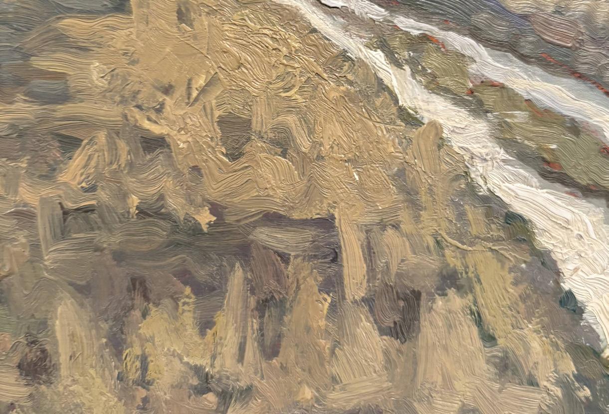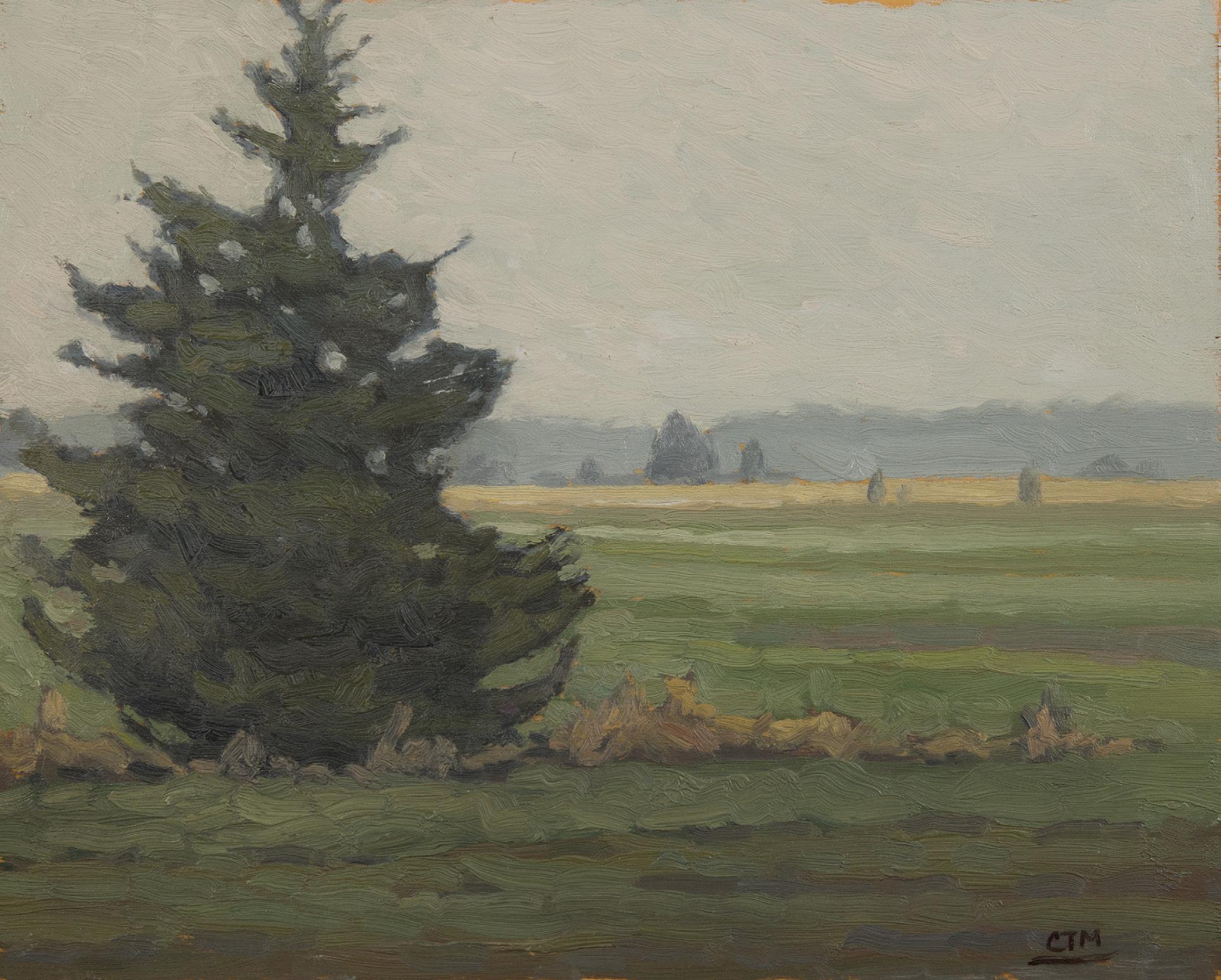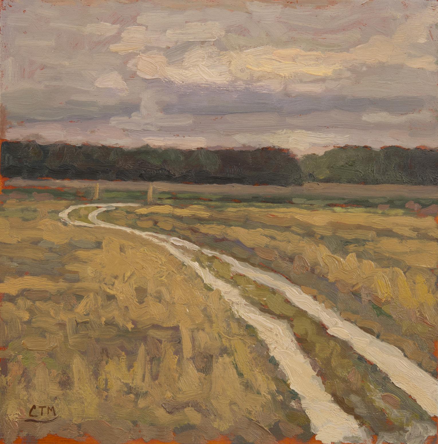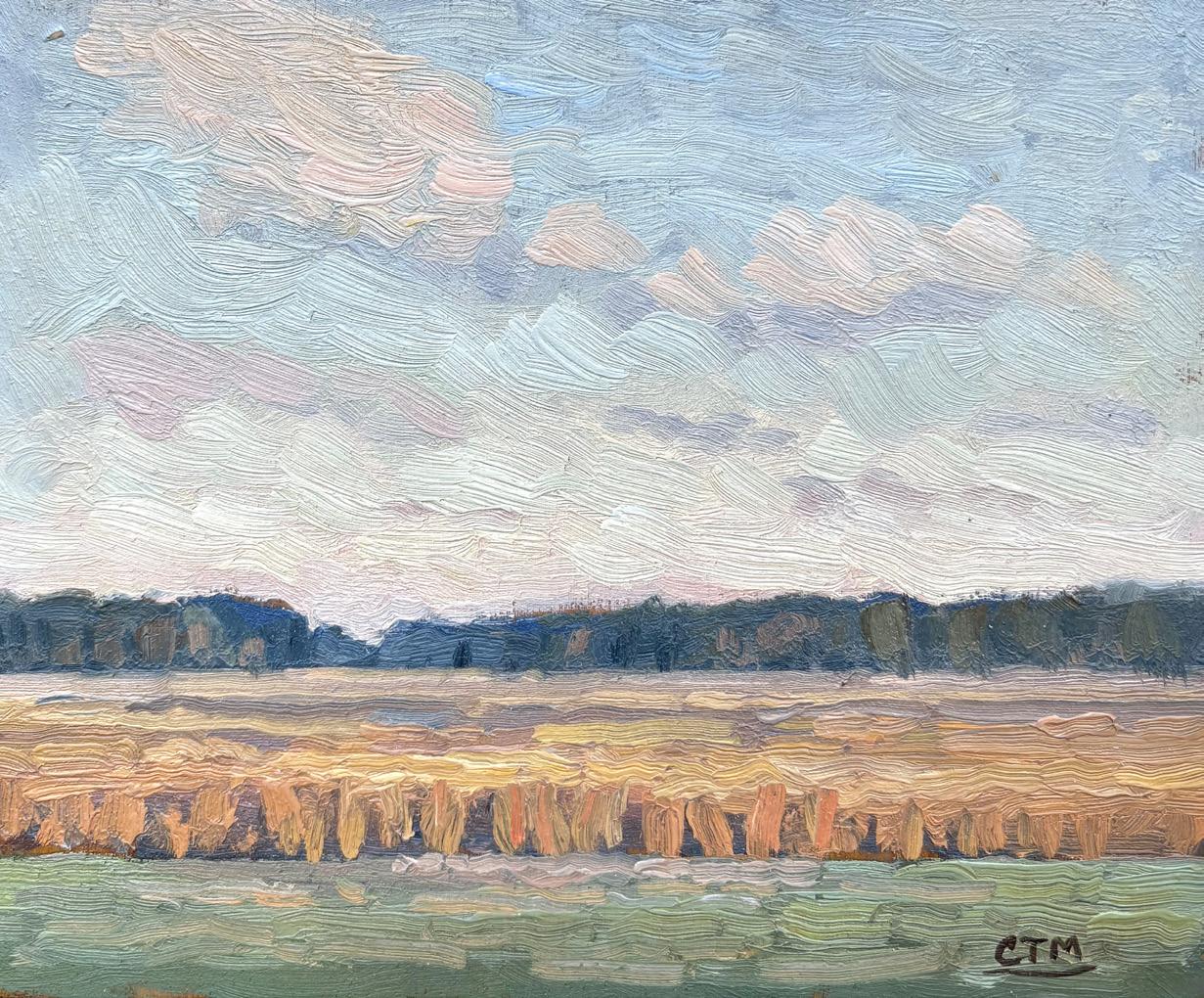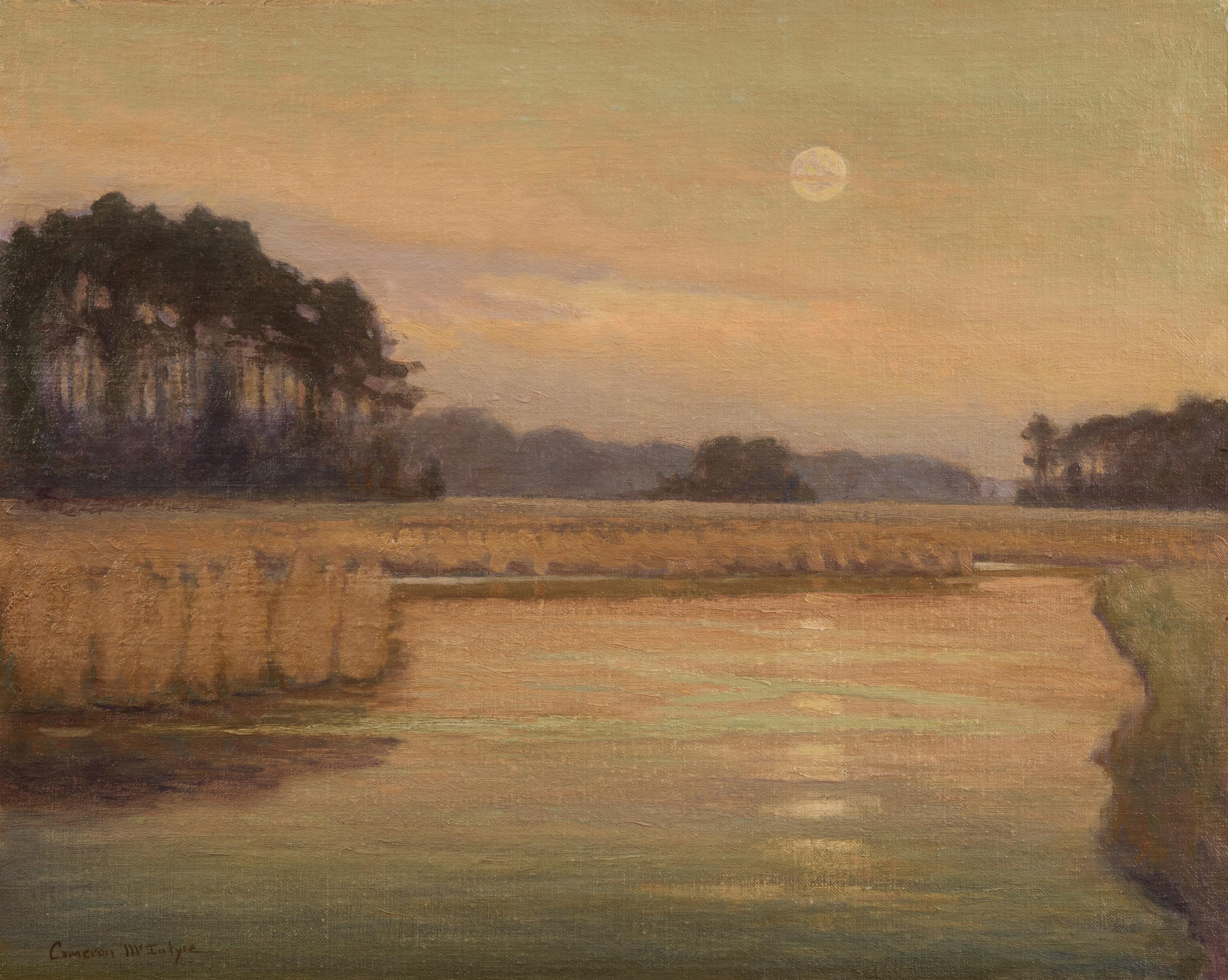 In depicting the essence of our unique landscape, immersion and understanding is key. What sets McIntyre apart from the many accomplished Plein Air artists who explore this area in their work is that he lives in the land, in a farmhouse that overlooks the characteristic expanses of this region and cycles through the colors and crops of the seasons. This allows McIntyre an appreciation of the quotidian and not just the dramatic. The painter notes that he only paints when “the memory of a scene will not leave his mind”. In miles and miles of memorable scenes, his appreciations and curiosities are as artistic as they are knowing: in the unassuming, undramatic flatness of the Chesapeake, McIntyre always finds beauty and grace, without the help of constant catharsis. Lingering Snow is a great example: the snow itself lies quietly in a small stretch in the middle of the painting, its approaching fate contributing a cinematic quality to the scene. With McIntyre’s guidance and virtuosity, the viewer is transported to simple but fundamental experiences, such as observing a small pile of snow get smaller as the day warms; walking through tall grass towards a marsh; hearing a dog run through the trees; wind changing direction; the full moon peeking through shifting clouds. These are moments for a person to take a breath and think, this must be what it means to live.