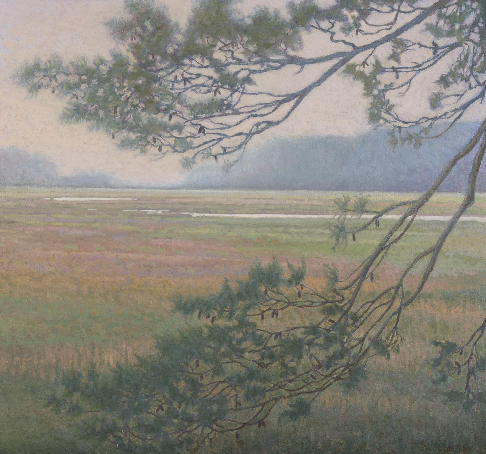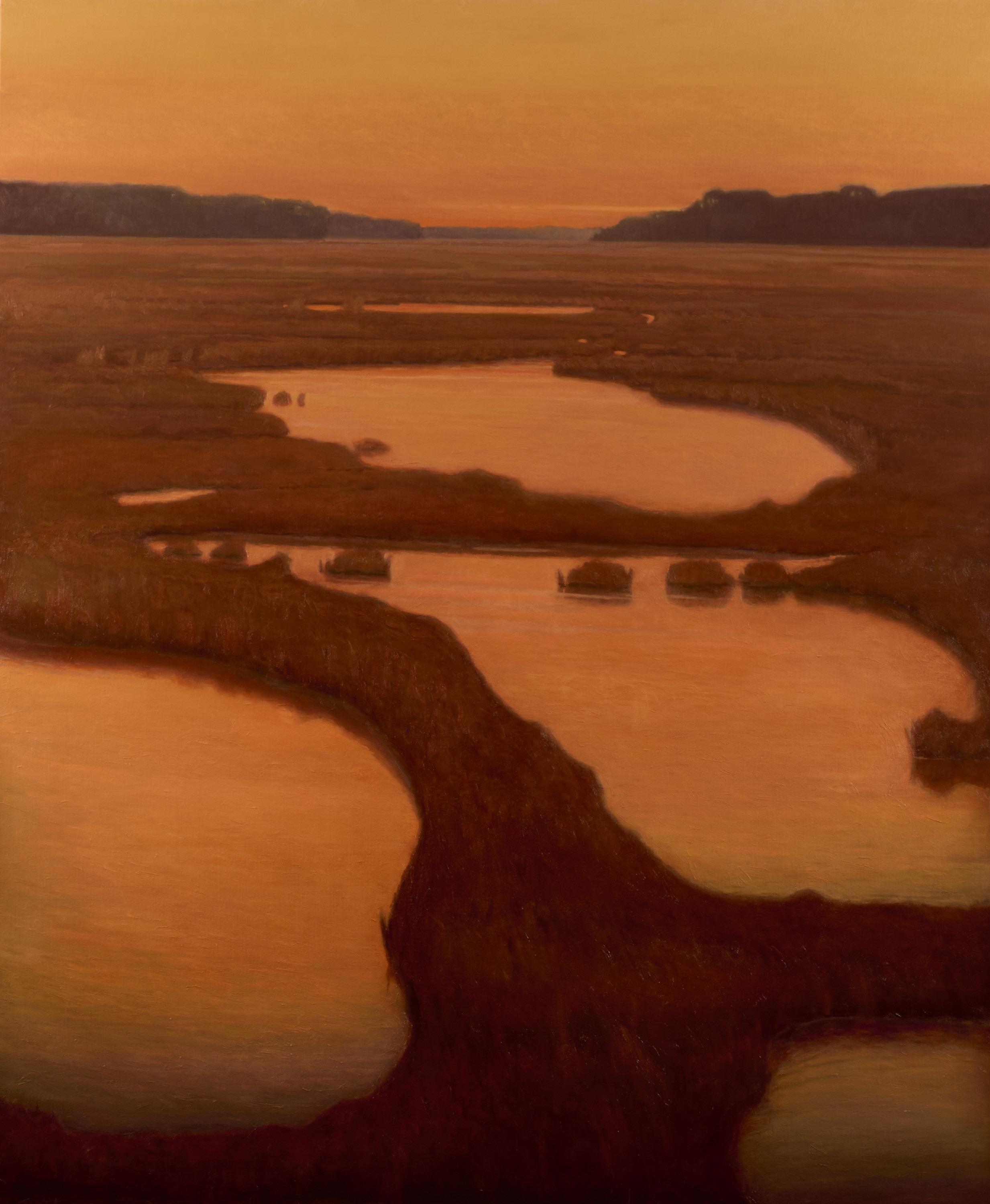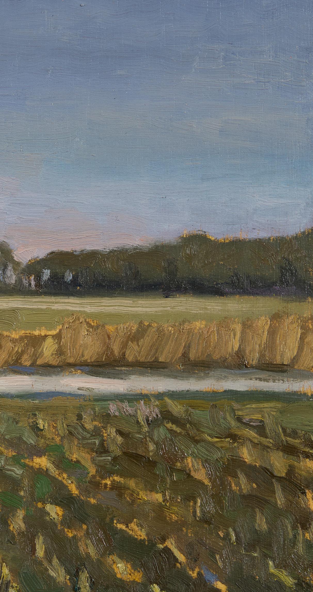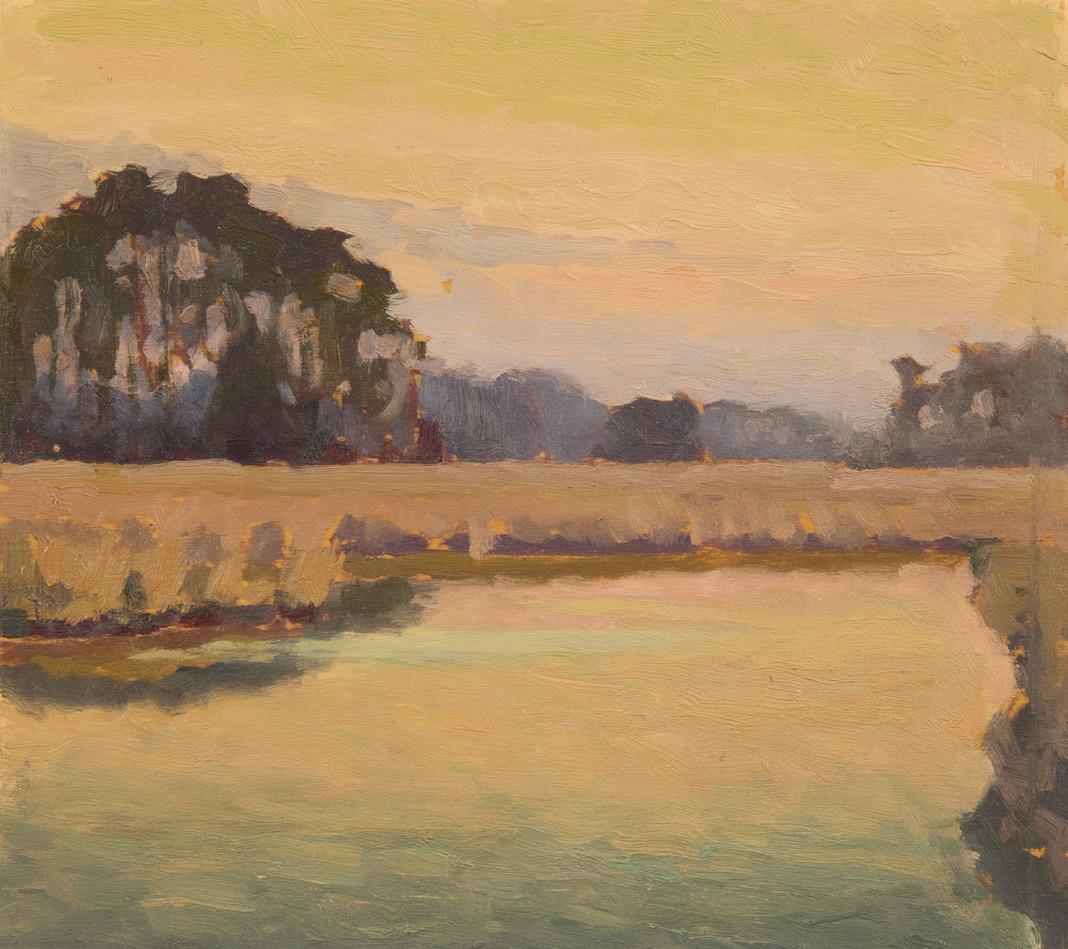 McIntyre has a loose and atmospheric visual language, although in some paintings he creates beautiful counterpoints to the aforementioned haziness by delineating the edges of his trees, awarding them the focus of a main subject. This is indexical to his love of the land: a wanderer might take in a landscape as a beautiful whole, while McIntyre knows his deeply-rooted subjects and individuates them effortlessly. His water scenes also communicate the experience of someone who has been in the marshes for a long time – Bayside Serenade , one of the larger paintings in this catalogue, pays close attention to the unity and variety of this fast-changing landscape, as the viewer looks down on it at scale. As the seasons change and water lines move, the unique shapes and forms the Chesapeake Bay sing through McIntyre’s expert hand.