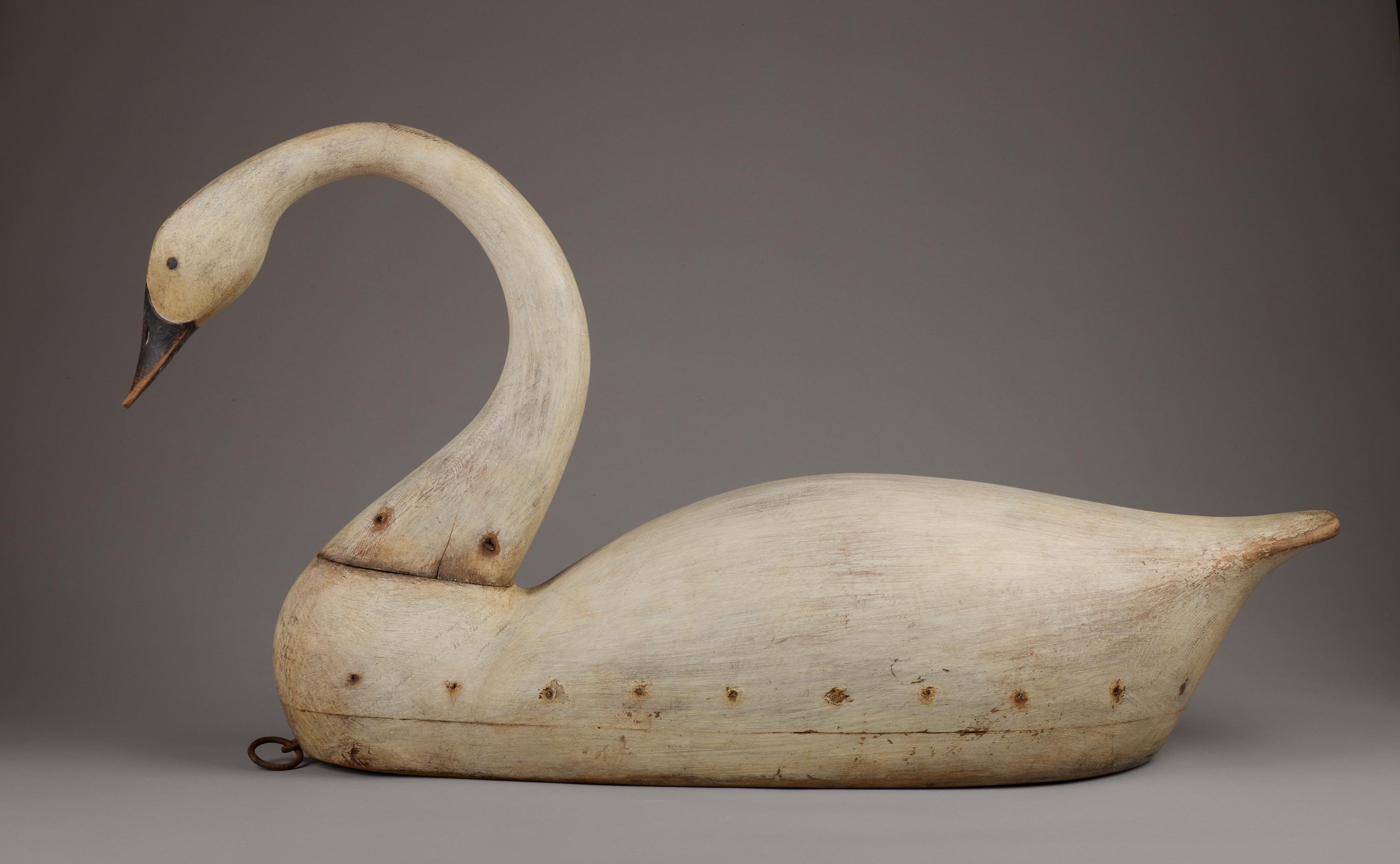 McIntyre’s practice as a decoy carver offers the same kind of meditative respect to his subjects as his paintings: there is quiet delight in how his waterfowl are animated in beautifully and faithfully-determined poses and paint patterns. The dynamism of some of the artist’s choices are especially striking: the ubiquitous Canada goose’s neck, for instance, is observed in an elegant curve that contrasts beautifully with the subtle detailing of its plumage, while Barn Find Goose is carved in high, forward momentum.