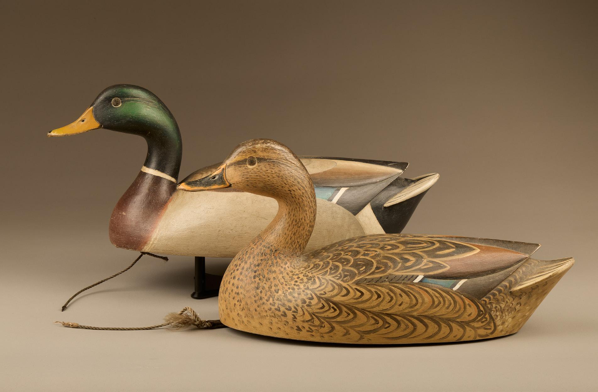 The artist offers different approaches to decoy anatomy through his outlines: his Pinch Breast Pintail pair , inspired by the Ward brothers, have flowing lines and the delicate, meticulous, and in places, stippled painting pattern that is well-known to decoy lovers, while his high-contrast Upper Bay Canvasback pair demonstrate head styles with sharper angles and heavy, colorblocked patterns that offer subtle yet compelling rendering, almost at the edge of abstraction. Feeding Brant is just as delicate, as the slight turn of the bird’s head contributes storytelling and reflects McIntyre’s careful observations of his subjects. The piece that ties the different aspects of the artist’s practice, however, is Black duck still life (two drakes) , where McIntyre is able to demonstrate the full virtuosity of his practice. The two life-size subjects hang beautifully, their