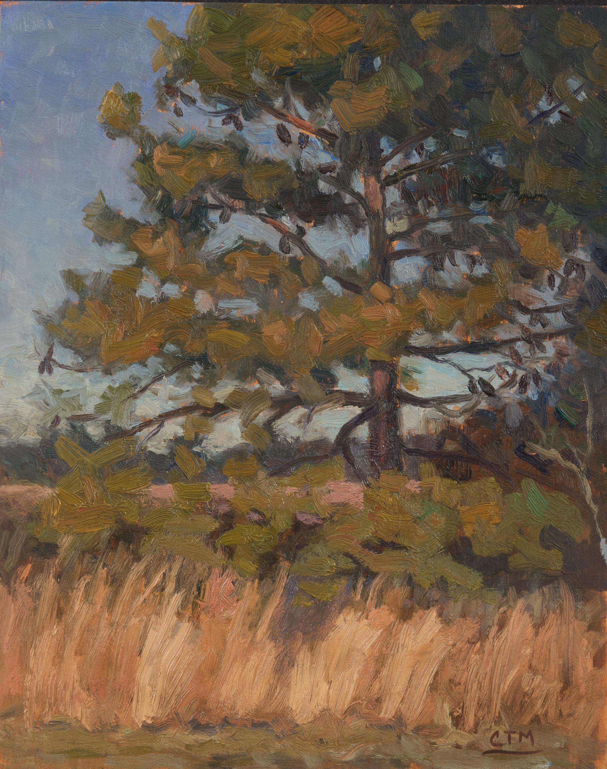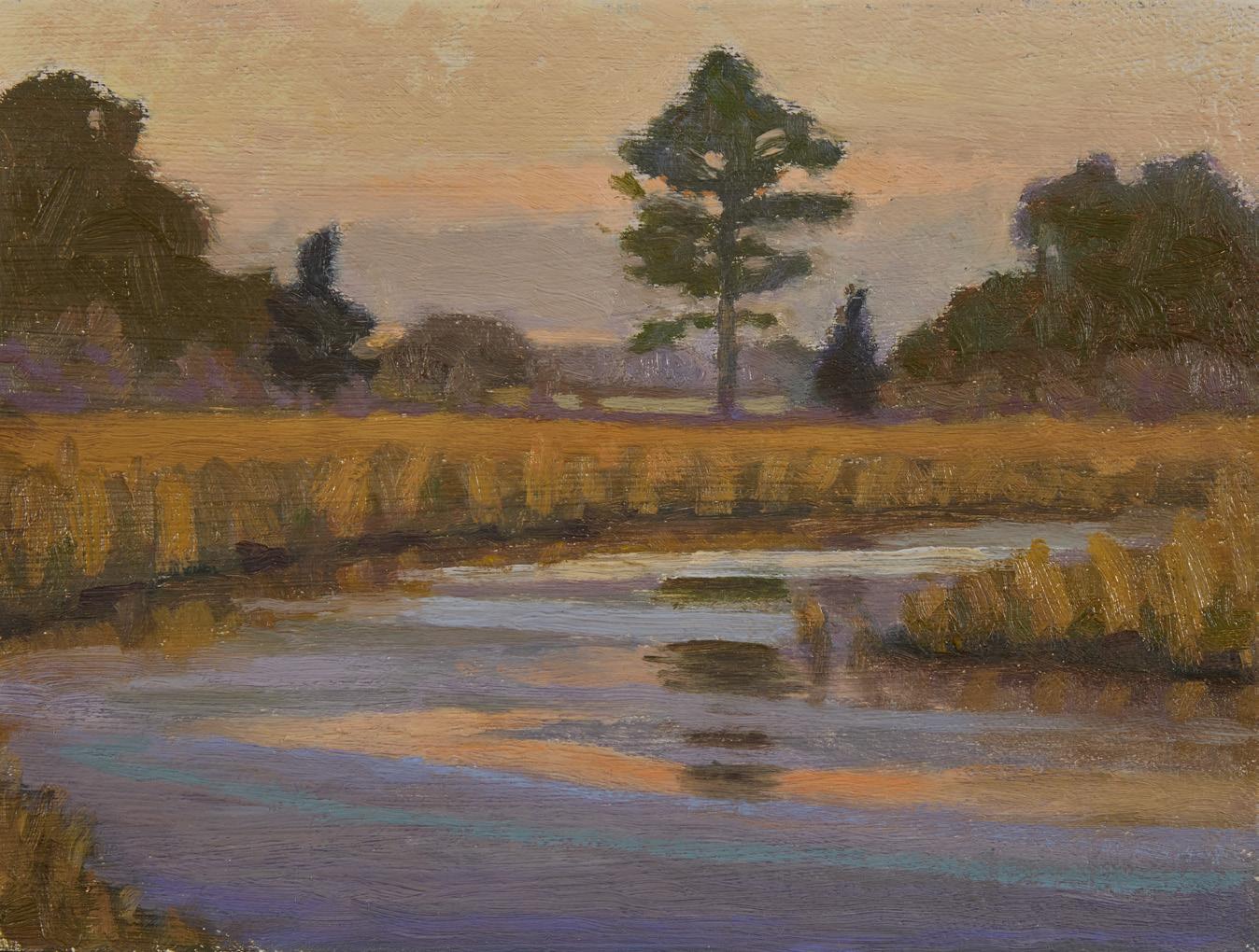 with the Impressionists, who pushed back against the conservative formality of academic painting. The Chesapeake Bay is full of rewarding vantage points for painters seeking such freedom, but also a challenge: painting in “open air,” as plein air is often translated, needs sharp artistic skills, virtuosity, and a resistance to the elements - just ask anyone who has competed in Plein Air Easton in one hundred degrees in mid-July. As freeing as it is to come up on a landscape and think, this must be the place , rendering the scene artistically and not with the exacting interests of a cartographer or a naturalist is key. McIntyre’s Plein Air practice is unique because of his quietly-animated scenes, which effortlessly surpasses expository reporting: his artistry allows you to understand that something has just happened, or is about to happen, to the light, the reflections, or the flora and fauna. And crucially, McIntyre is simultaneously a student and a master of color: gamut is so central to his practice that rather than rely solely on photographs of a scene, he creates field studies that are high-fidelity and recreates them faithfully in the studio. His canvases thus seek the re-emergence of an experience through the fundamental elements of artmaking. The paintings in this exhibition chart a full changing of the seasons through color, intimated not just through subject matter but through thoughtful titling. The transitions and dynamic and varied brushstrokes – especially on the artist’s horizon lines - present subtle yet powerful explorations of a scenic world. The viewer can enjoy the full breadth of his detailed storytelling by coming close and going far.