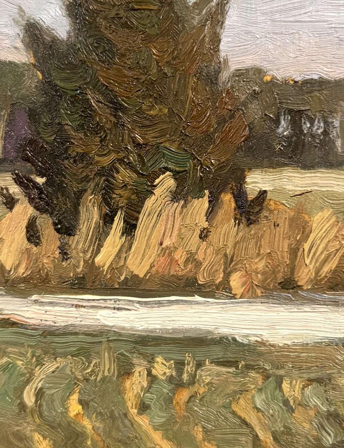 Fundamentally, Cameron McIntyre’s paintings are delicate studies of light and time. The artist paints and carves in a way only someone who has been deeply changed by the Chesapeake Bay can: each piece is simultaneously of the moment in which the artist encountered a scene, but also of the millennia it took to form the beautiful, languid natural forms around us. Activated by light filtering through the clouds, tree lines, marshes, and the like, the beautiful shadows of his paintings tell both the story of the landscape and of McIntyre’s life. The paintings consistently yield delightful complexity in the landscapes. While some scenes center a single element of the landscape as a photograph would, such as the road leading out from his farm in Leaving Home and the towering yet lonely cedar tree in Russ’ Cedar, his painterly haziness transforms the paintings into spiritual experiences.