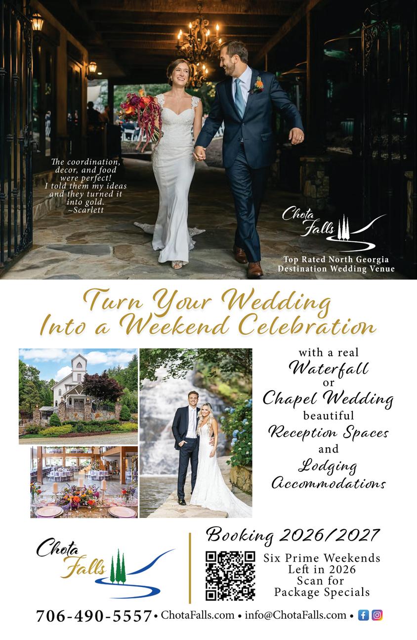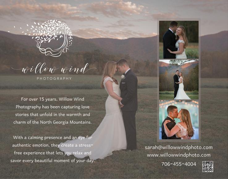 Welcome to the Spring Edition of Mountain & Lake Weddings. This special magazine invites you to plan your special day in the beautiful communities of North Georgia, Western North Carolina, and surrounding areas. We will feature many articles to inspire and help you plan a spectacular and unique event. We invite you to explore our community of professionals in the pages of Mountain & Lake Weddings of planners, venues, photographers, florists, jewelers, and accessories in helping you plan your special day. Be sure to look throughout the magazine for articles and in the back of the book for checklists in preparing for your event. Visit our website www.MtnLakeWeddings.com or follow us on social media, for inspiring ideas, tips, and more about our wonderful area.