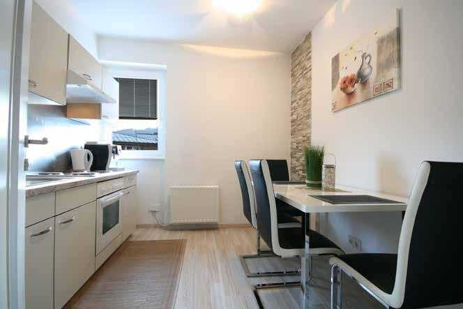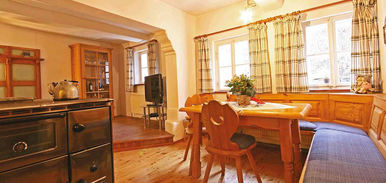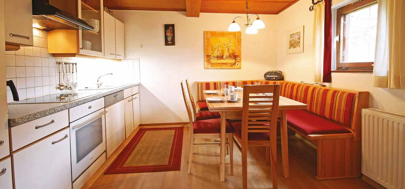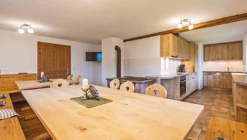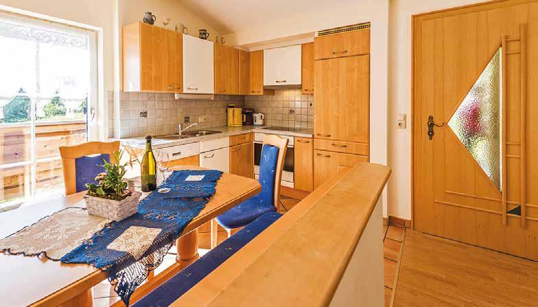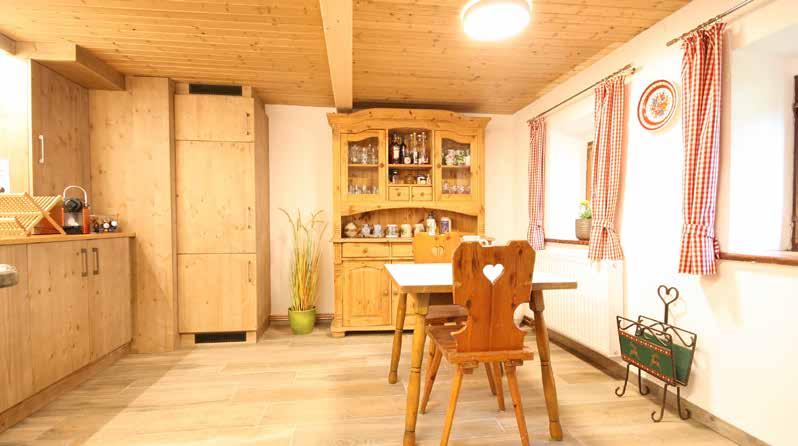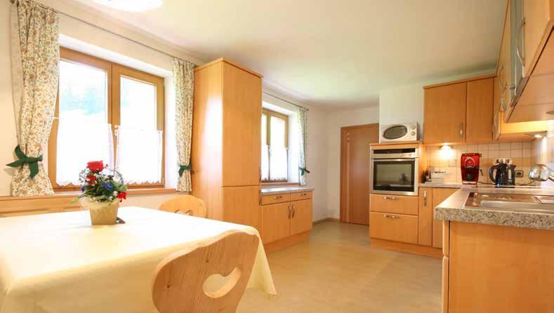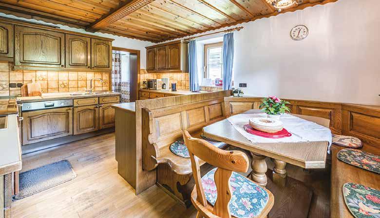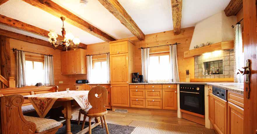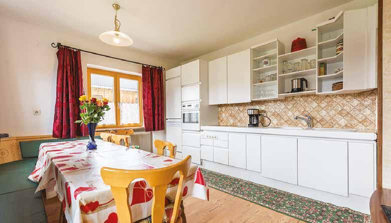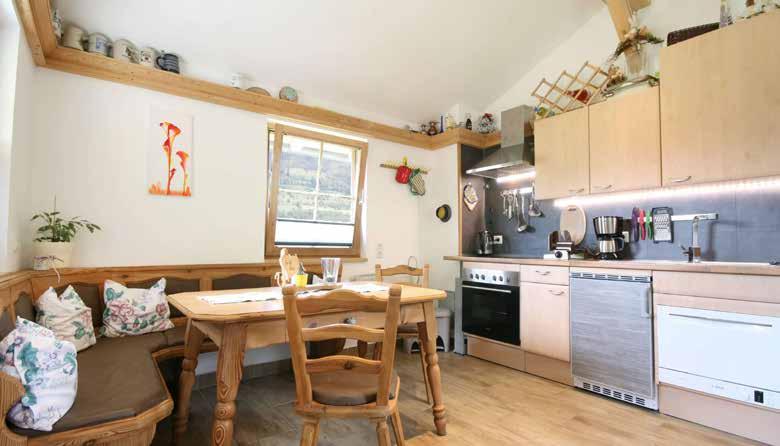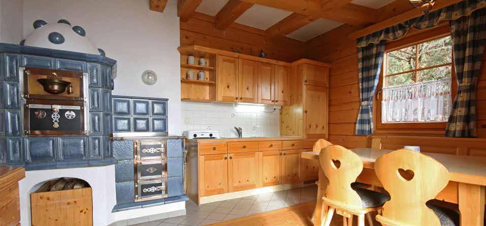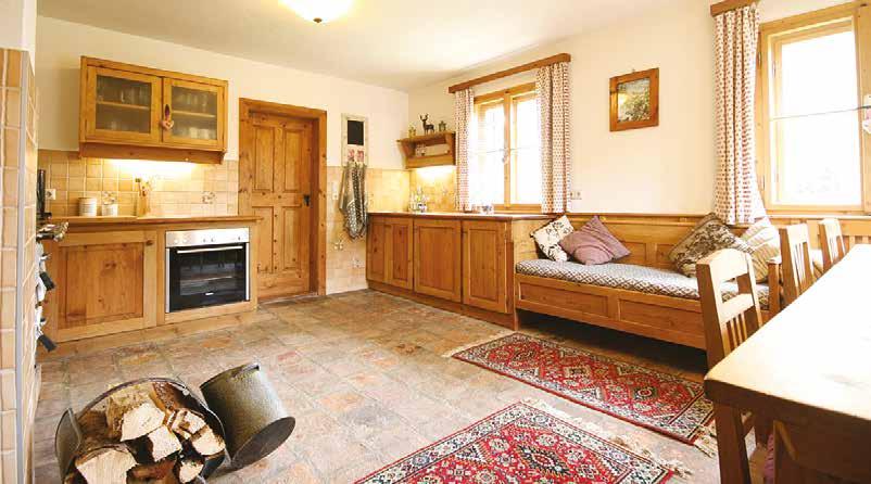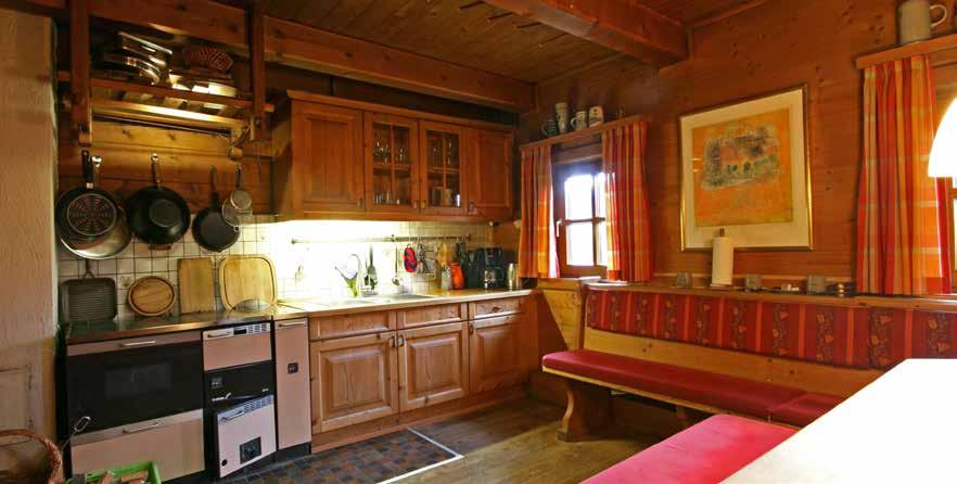 Erdgeschoss: Stube, Sitzecke, Bauernofen. Küche, Holzofen (integriertes Backrohr), 2-Platten-Cerankochfeld, Kühlschrank mit Gefrierfach, Spüle, Filterkaffeemaschine, Espressokocher. 2x Doppelbettzimmer. Bad mit Dusche/WC