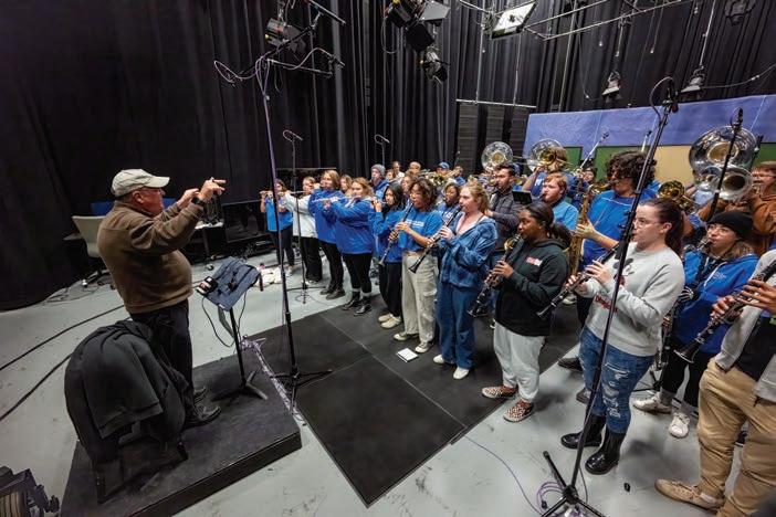 The top-tier Department of Recording Industry helped the Band of Blue produce an updated recording of MTSU’s fight song, as 67 members packed into Media Arts’ Studio One.. A project two decades in the making, it required a lot of technology in a tight one-hour window.