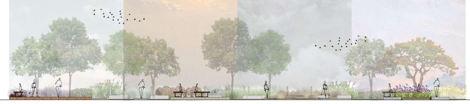Solitude pockets Cascading water body Pathways represented as roots Step seating area Cascading water body Banyan tree as focal point Pathways represented as roots Hidden seating pockets Solitude Seating pockets Hidden seating pockets Lawn areas Pathways represented as roots Step seating area Banyan tree as focal point The corridor design cleverly uses roots to create a refuge extending the concept throughout the space. Roots are turned into swings for seating, pathways mimic organic forms, and water streams create a serene atmosphere with mist swirling around. Some roots also serve as lights, making the space usable at night. View during day View during day night