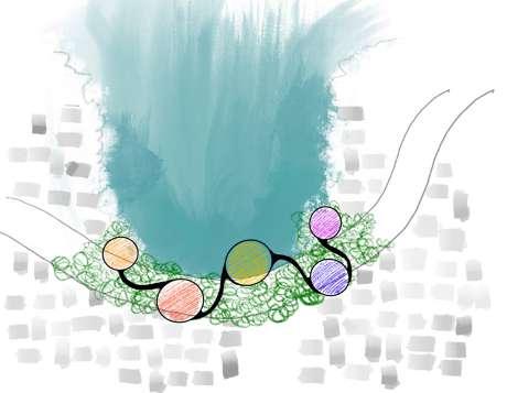 • Pergola with creepers over a waterway, encouraging connection with nature.