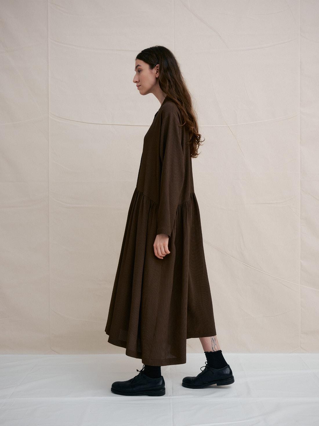 C1316 DARK BROWN GINGHAM BAND COLLAR DRESS