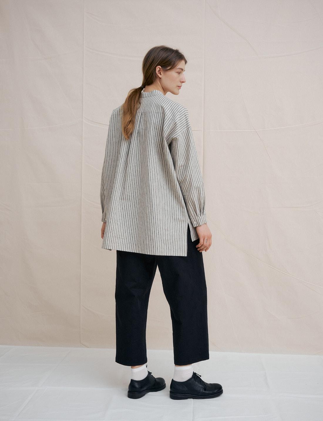 C1299 BEIGE STRIPED BAND COLLAR SHIRTS