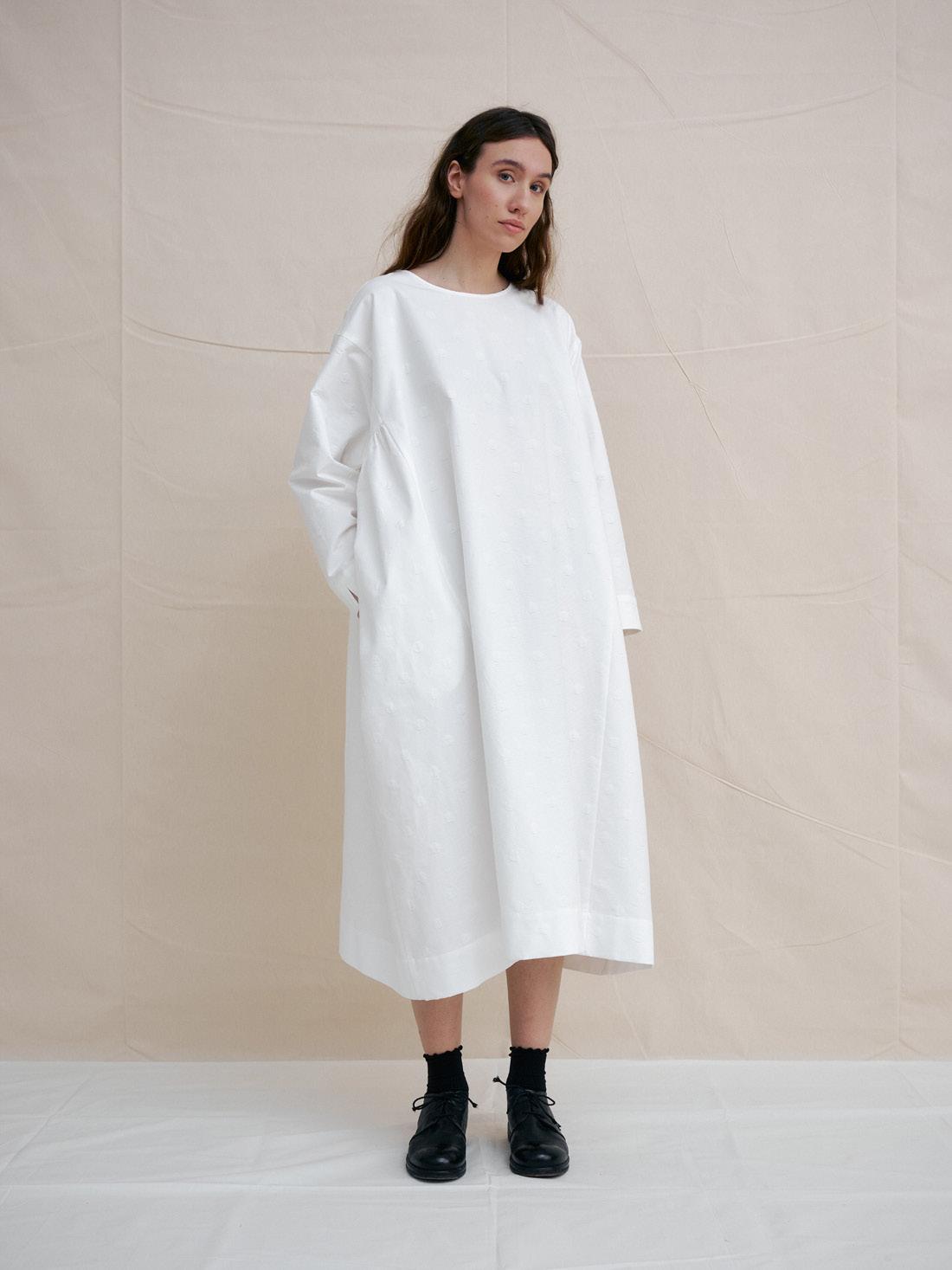 C1312 WHITE DOT GATHERED DRESS 100% ORGANIC COTTON