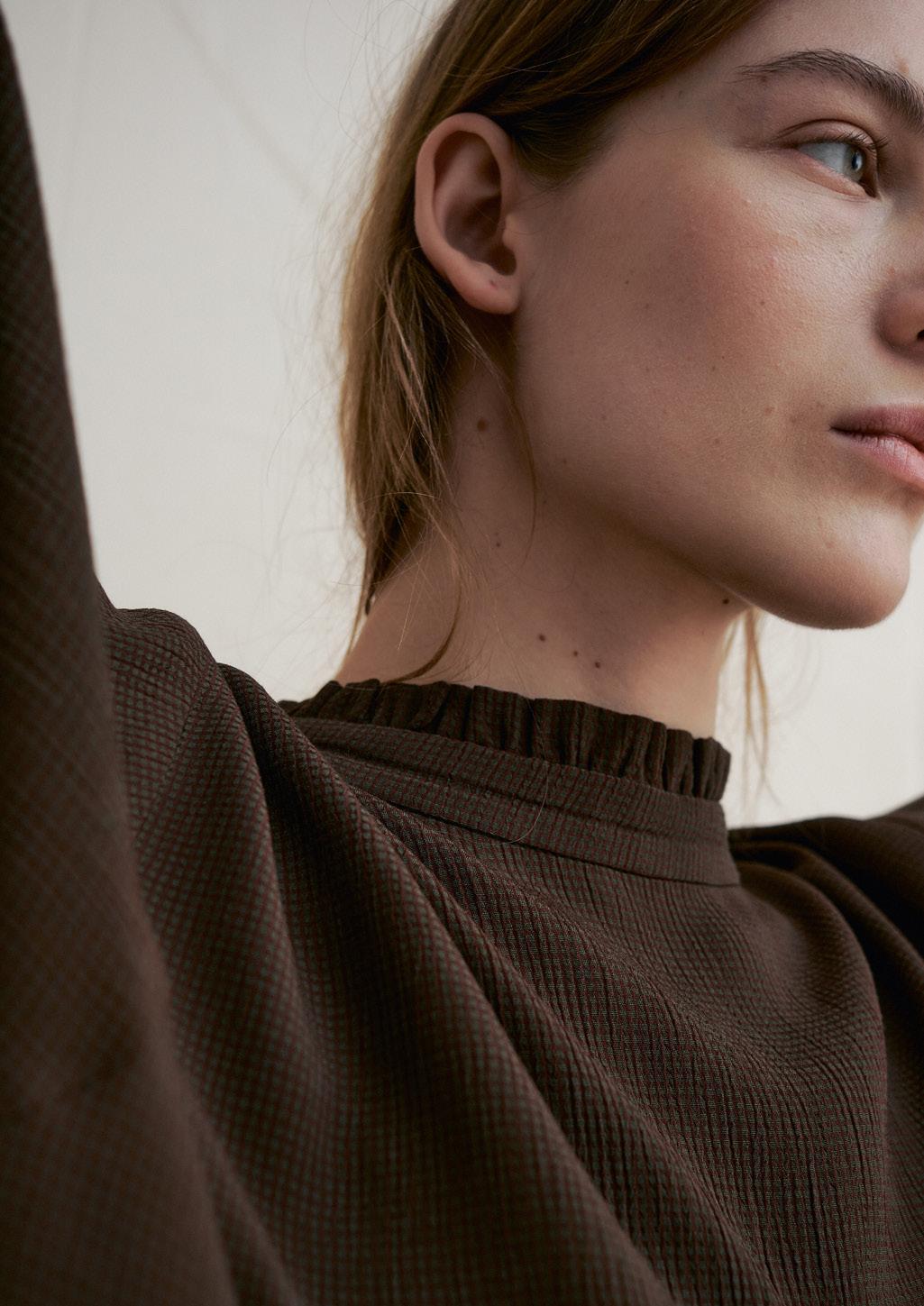 C1304 DARK BROWN GINGHAM SIDE GATHERS TOP 69% SILK 31% VISCOSE