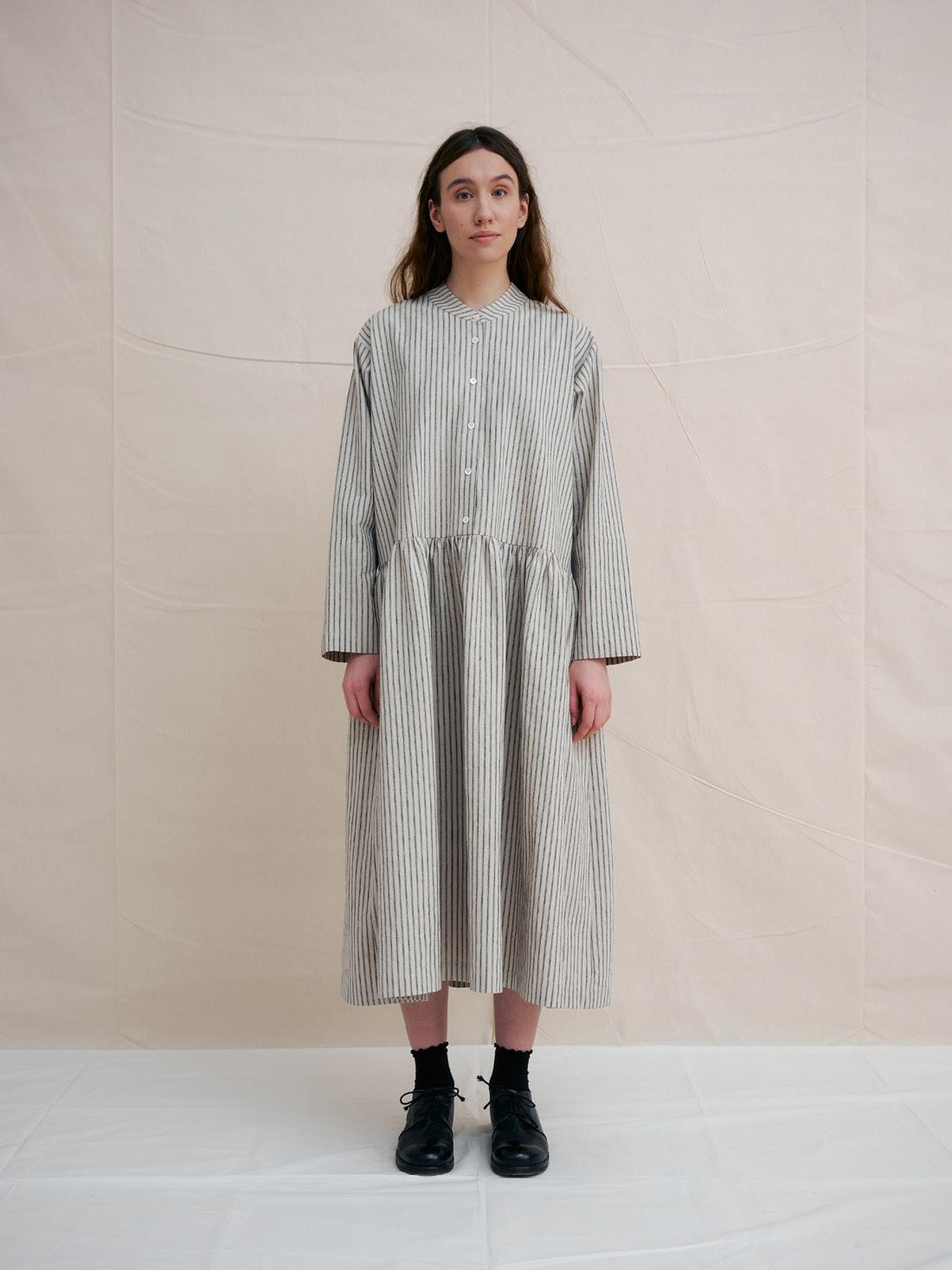 C1315 BEIGE STRIPED BAND COLLAR DRESS 55% LINEN 45% COTTON